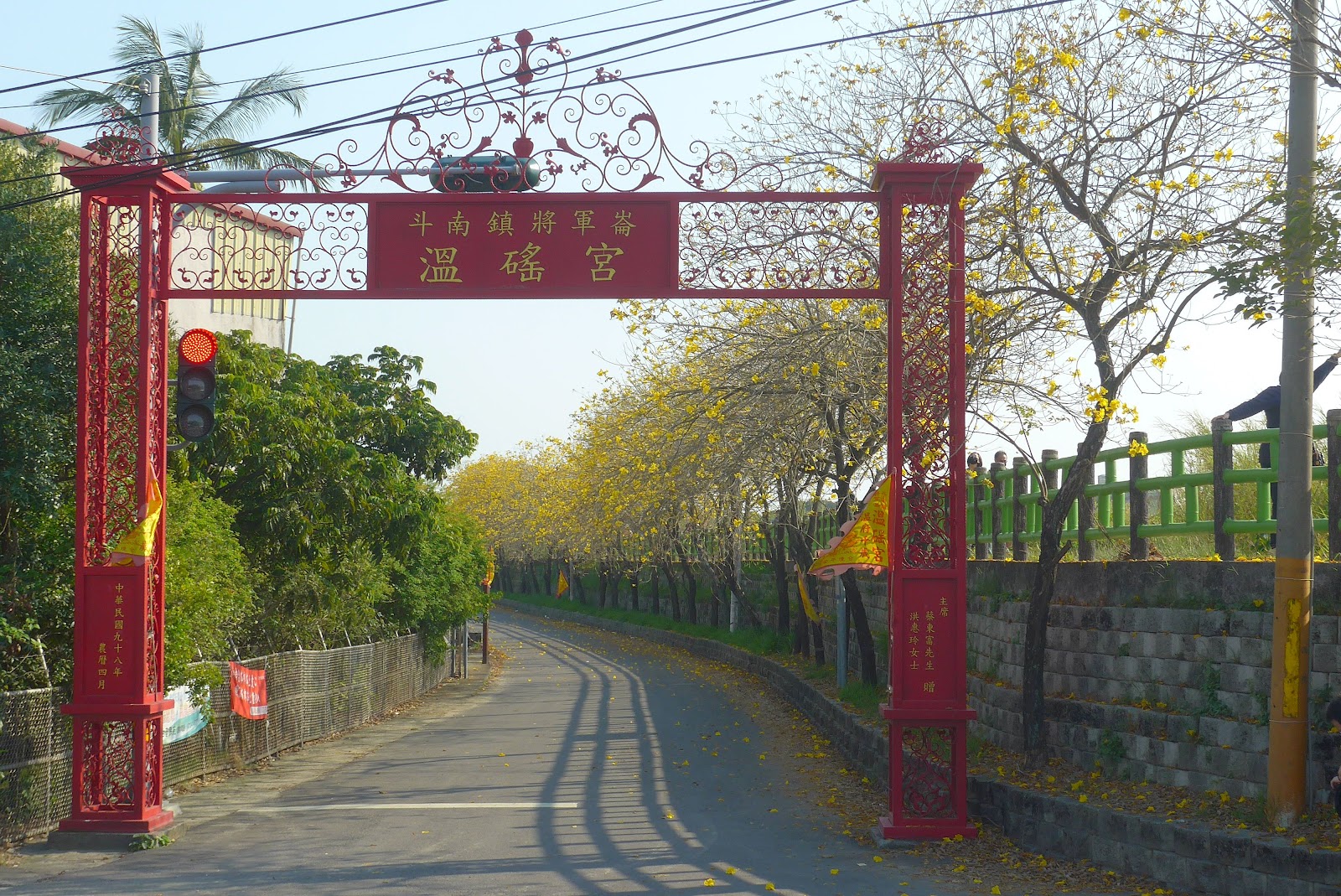 斗南將軍里溫磘宮前的崙仔溪堤岸兩側黃花風鈴木現正盛開,全長約有2、300公尺長,搭配堤岸上仿樹幹欄桿別具風味,不少網紅前往拍照分享,甚至有人認為是雲林最美的黃花風鈴木祕境。