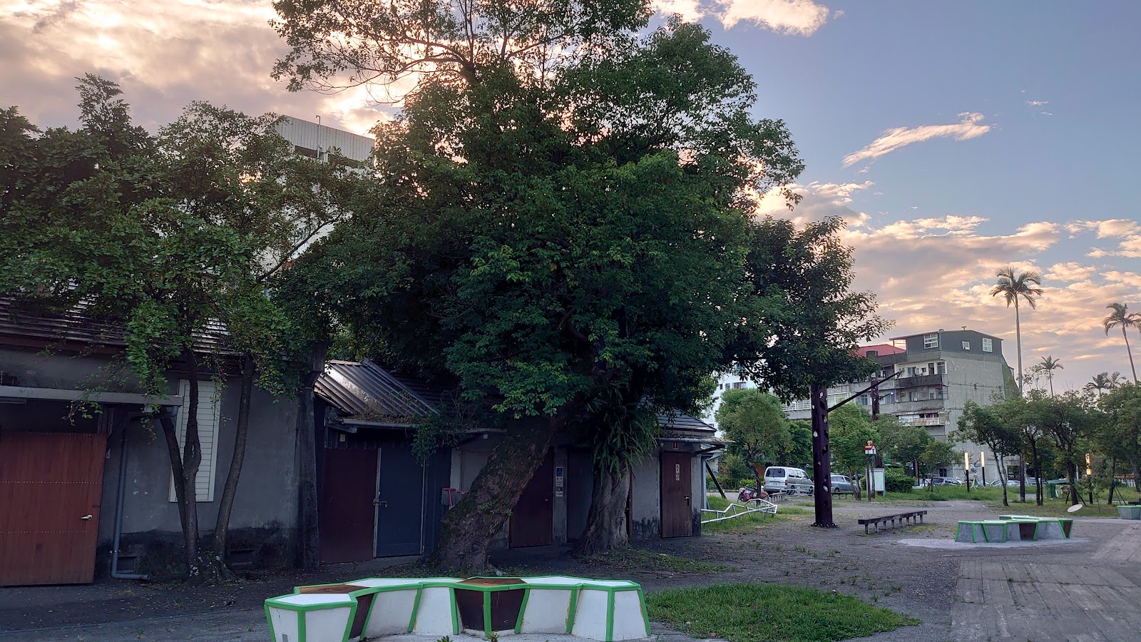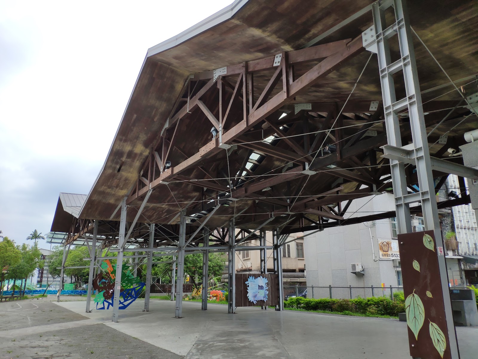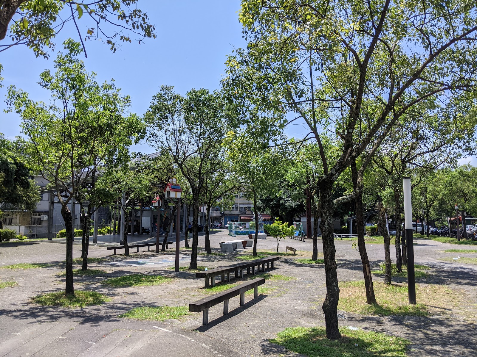 有大遮棚,週邊為住宅區。有公廁