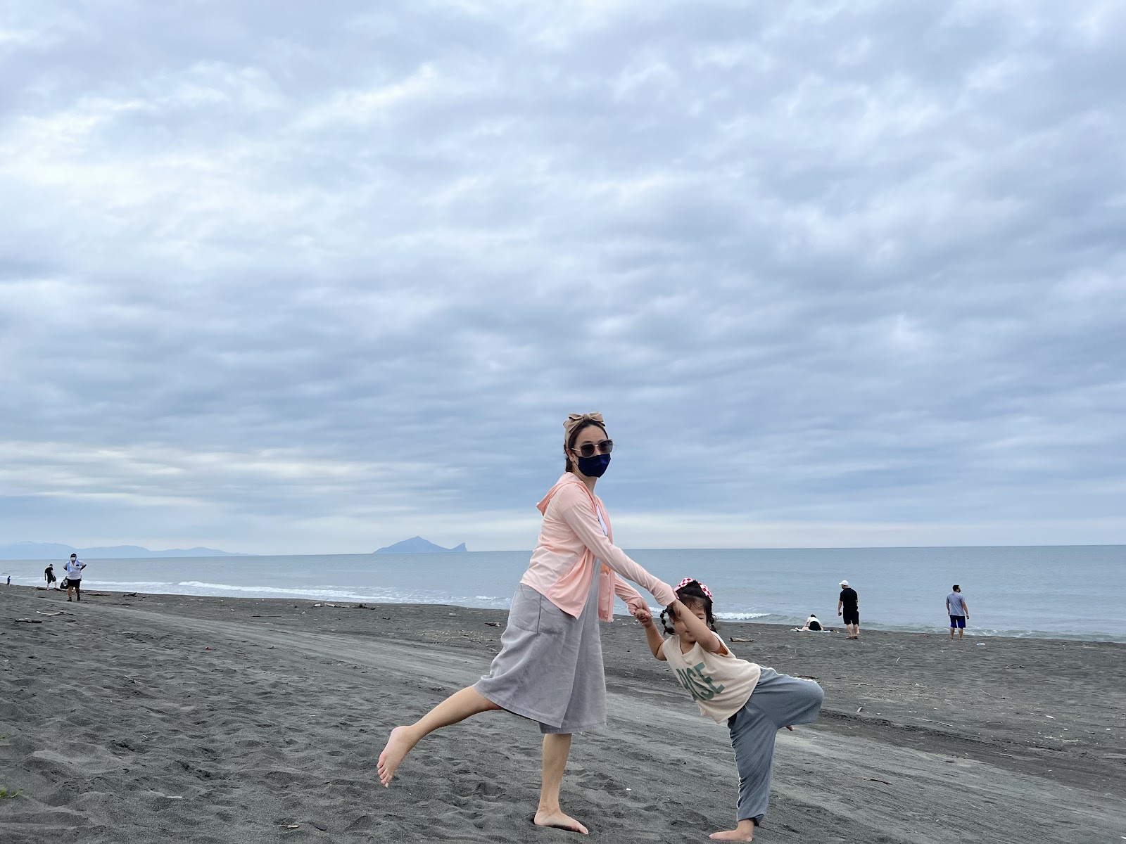 空曠的海邊,只有一些些遊客跟四輪驅動的車子,是個可以聽聽海濤跟海邊散步的小眾海灘,可以遠眺龜山島,但沙灘上也是有些海廢。