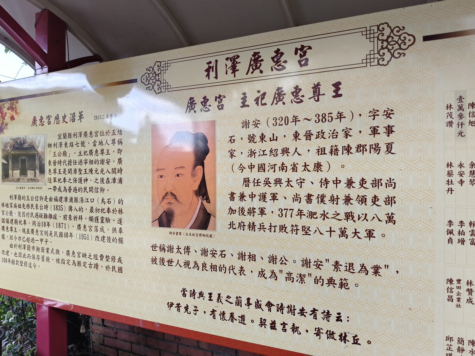廣惠宮:道光年間(1835年),林氏從漳州黑石林(烏石林),進入利澤簡堡定居。奉廣惠尊王(謝安)於林家公廳,為村民排解疑難雜症,進而由乩童倡首建廟。「向王公求虎皮保平安」、「爆尪(弄新娘)」之特色地方民俗活動,列為宜蘭縣文化資產的古蹟。