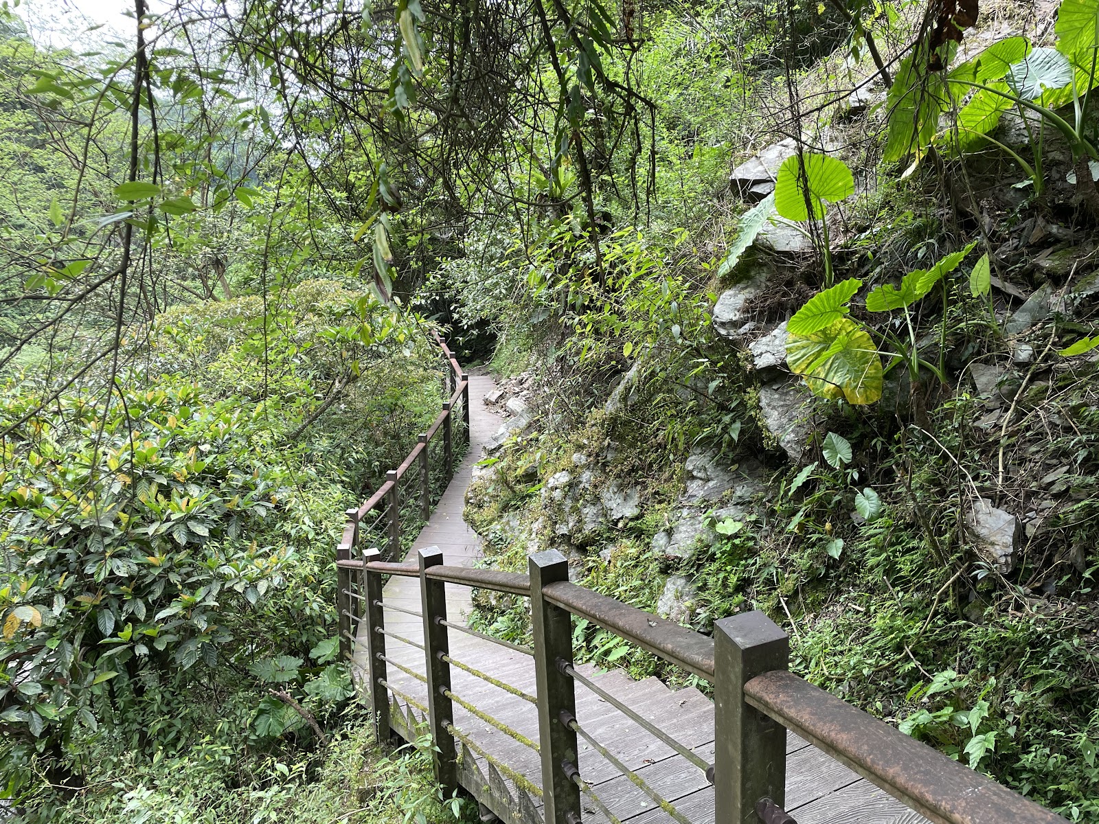半路有落石區,棧道被落石擊破旁邊沒有防護,可能要小心濕滑,還有一棵樹橫擋在路中間很有趣