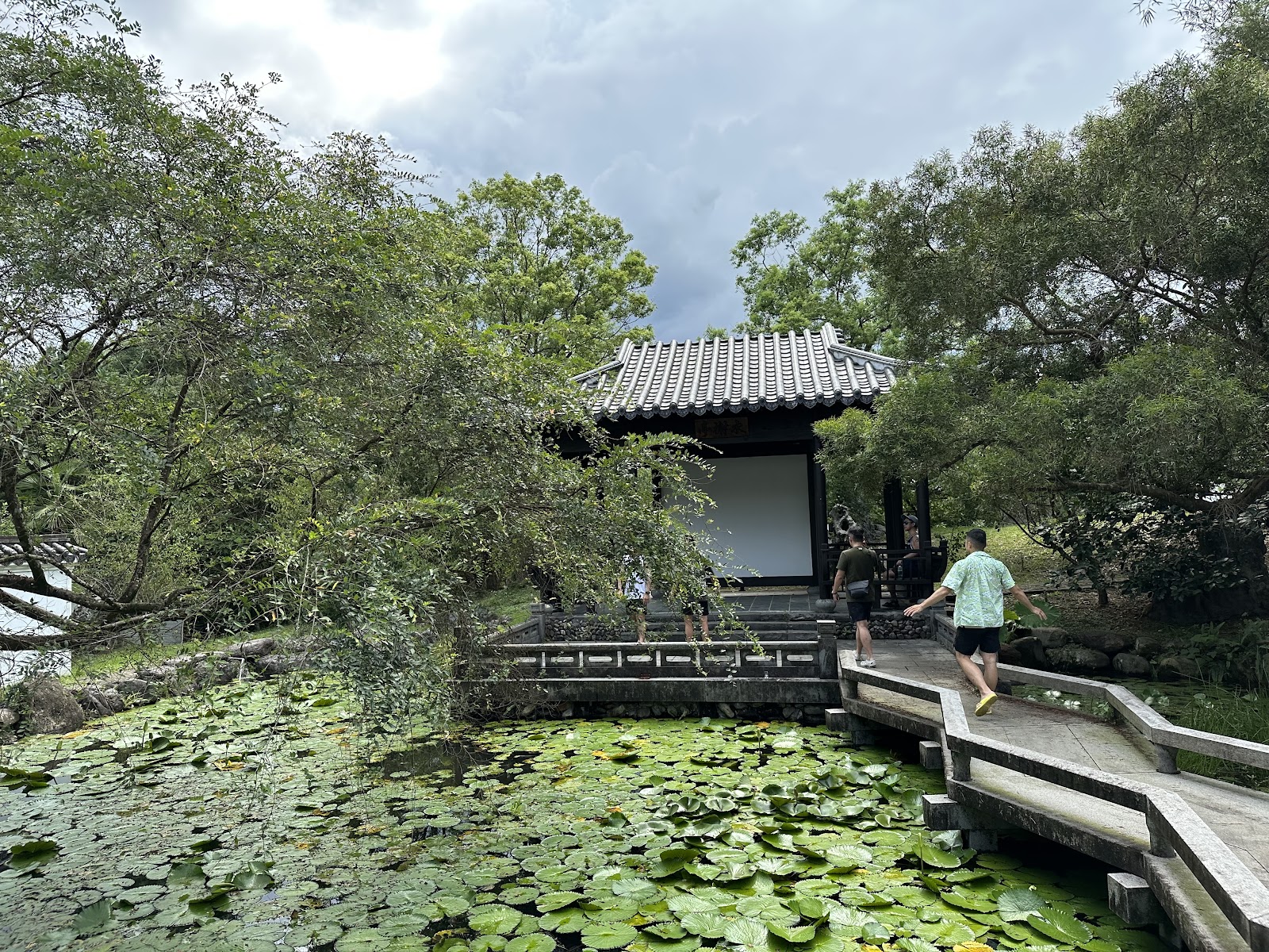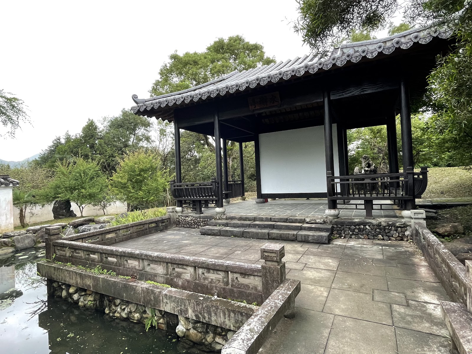 2、從日式庭園後繼續往下走可達中式庭園,可惜水景無流動較多青苔,不過寧靜中式風格涼亭跟建築,加上美人靠座椅,讓人舒心的環境。