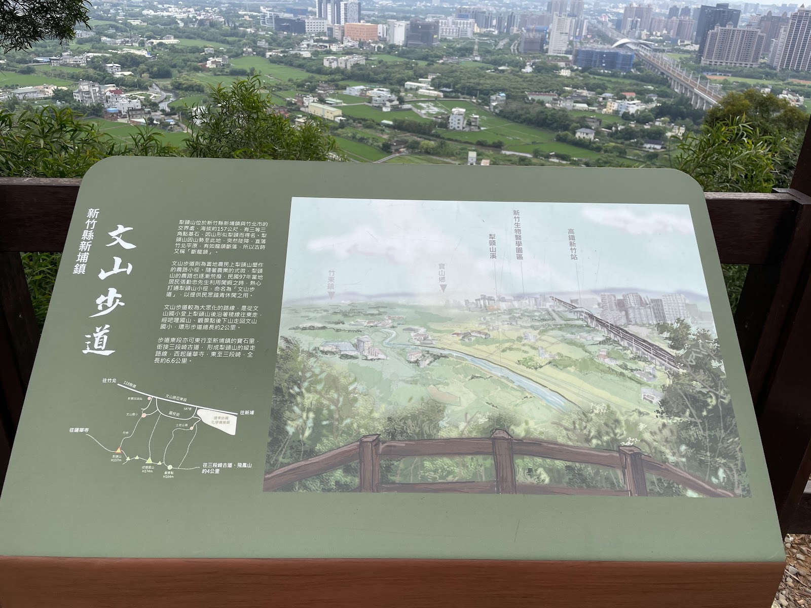 文山步道,新埔近郊親山健行的小景點,以走在稜線步道上透過多個可欣賞竹北市區與高鐵通過🚄的展望點聞名👑。從文山步道登山口起爬,一路上幾乎都是平坦好走的緩上坡水泥與石板道路,抵達犁頭山三角點可以看到第一個竹北市區與高鐵展望點,景緻相當不錯👍。持續往左取稜線步道會開始有一系列高架圓木鏤空步道,直達吧里國山三角點,走起來跟臺中大坑步道非常相似,可以體驗看看😊。整體而言,文山步道算是輕鬆好走、老少咸宜等級,有基本腳力者都能完成。不過這裡假日人潮頗多,若開車前來需於中油加油站⛽附近的登山口馬路兩側白線自行找位子停車。