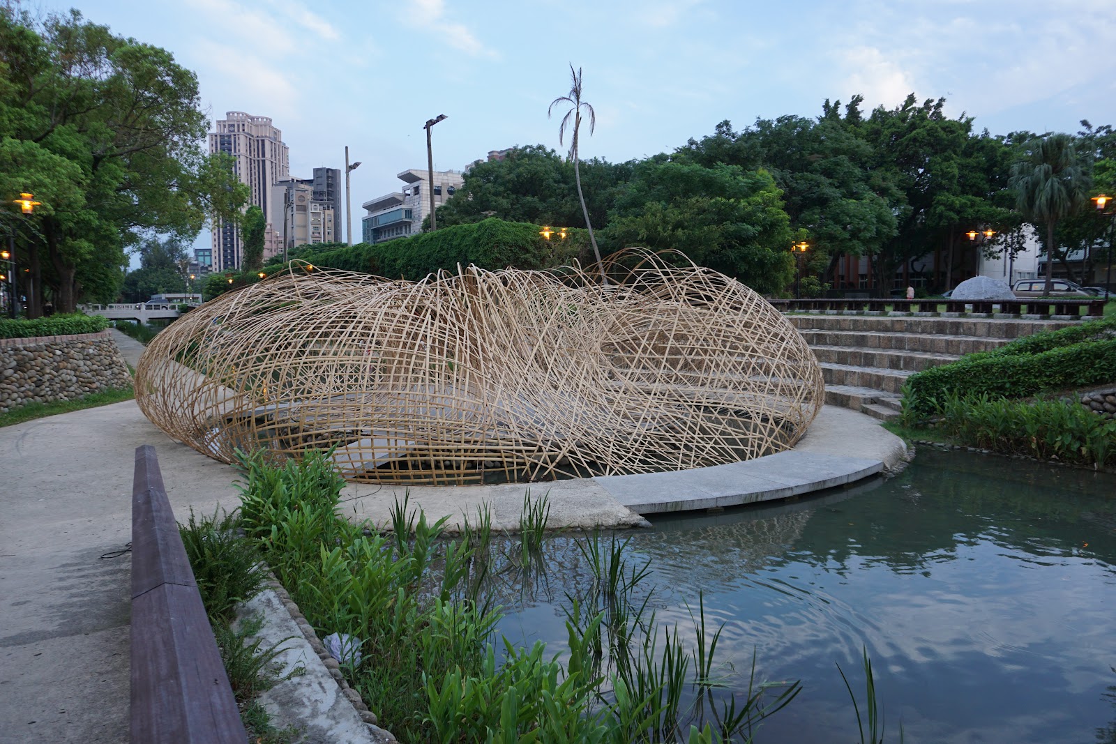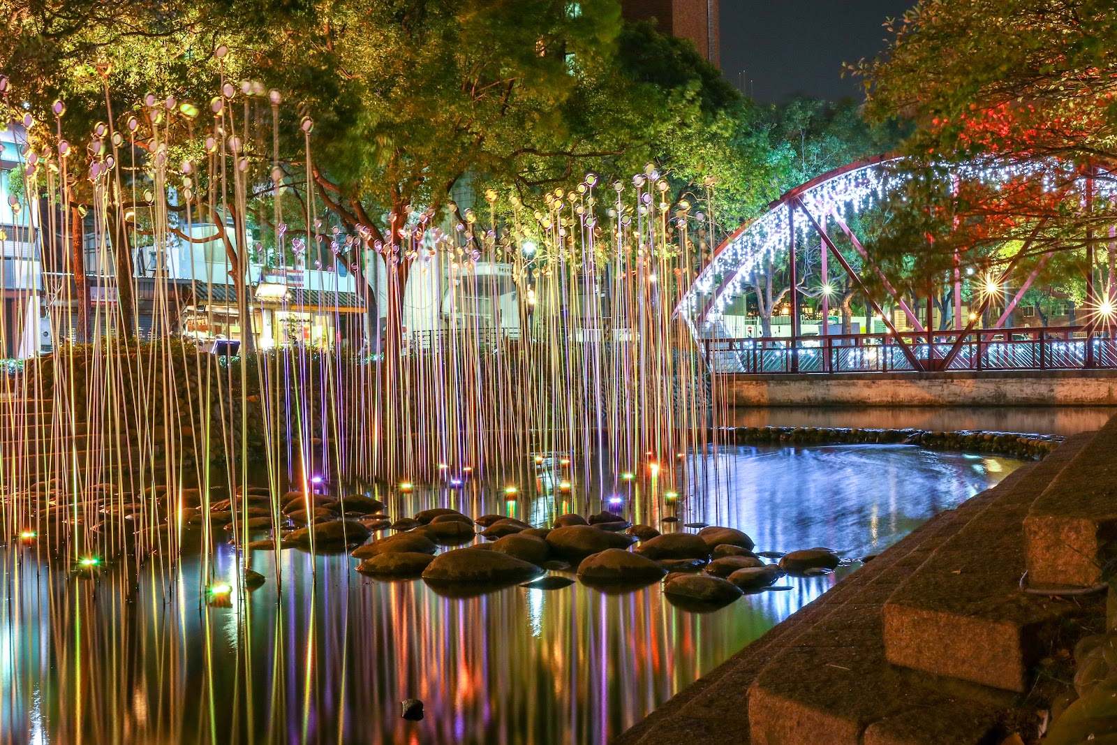 鬧中取靜,鴿子在草皮上進食、河裡魚兒遊,在市區裡,十分需要這類有樹蔭、草皮與小河的公園。夜景氛圍更棒。
