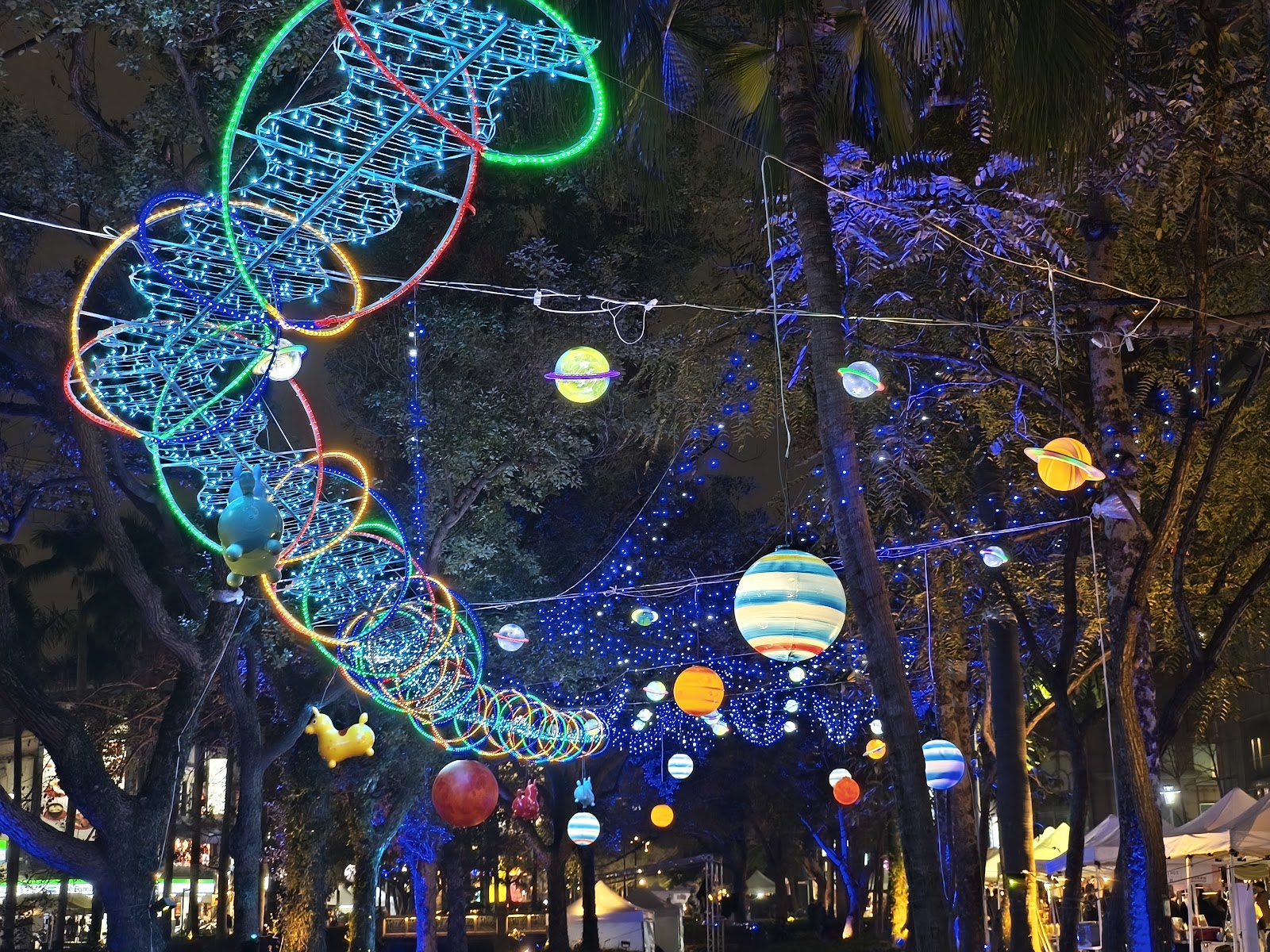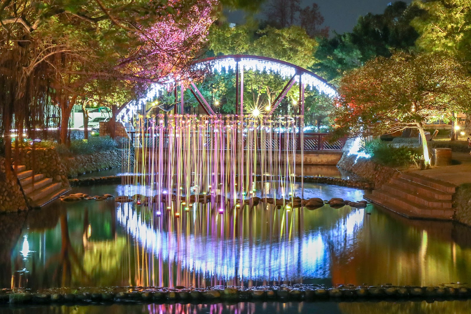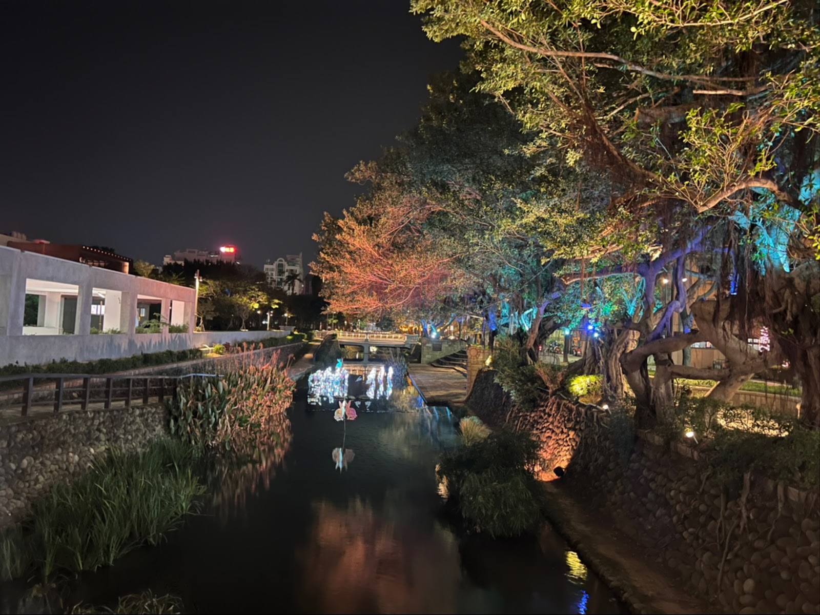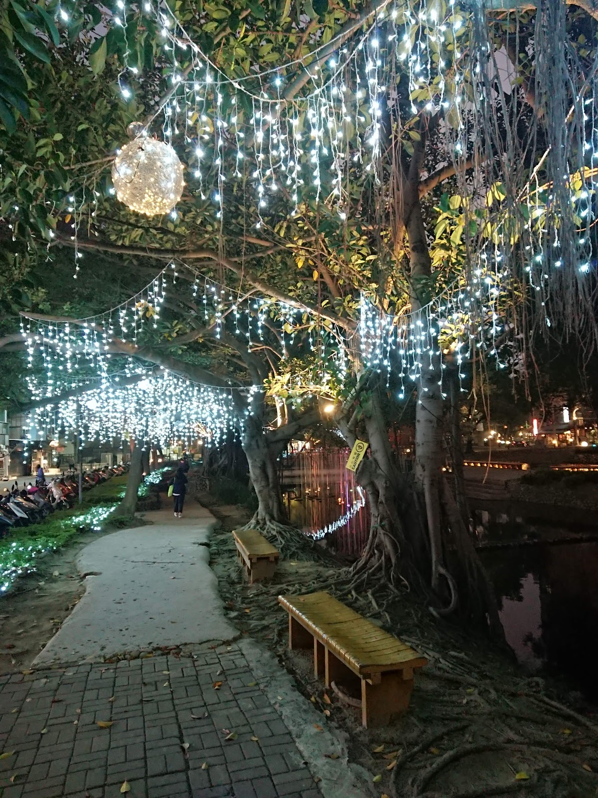 護城河旁邊有二二八公園,聖誕節有燈飾,過年有花燈。