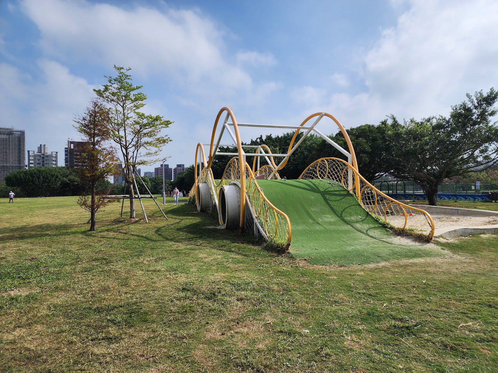 溜滑梯造型蠻特別的,可以拉繩索攀爬,有別於其他公園的攀岩設計。但溜滑梯不知道是不是設計出問題,斜度不夠滑梯表面雖然是磨石子卻很不滑,感覺攀爬的草皮還比較好滑。溜滑梯兩次有圍欄網設計,但卻粗糙的使用束線帶,而且線頭也沒有修的平整很容易刮傷小朋友的手希望能改進。