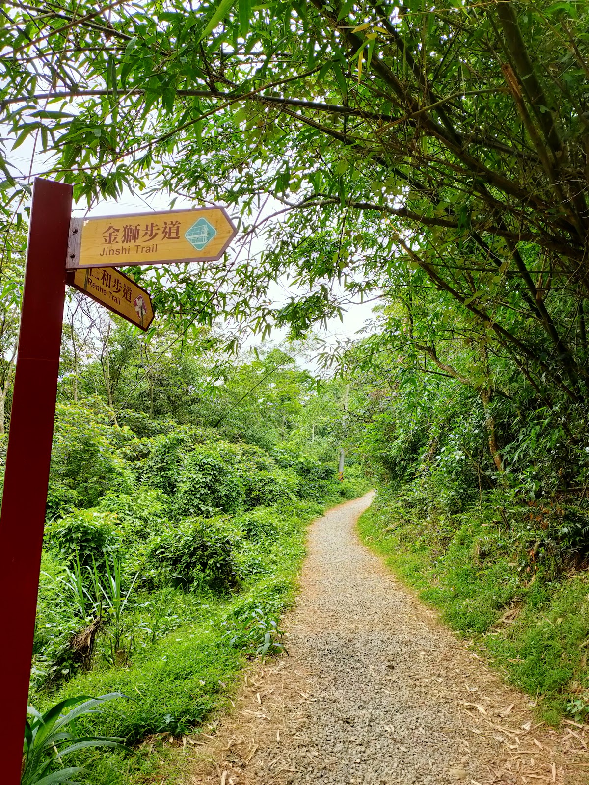 姑娘廟前有停車場,但無公廁比較不方便,步道平緩好走,沿途經過兩間伯公廟(土地公廟)快到金獅寺的階梯比較寬,可慢慢走欣賞路旁的竹林.之前居住在此的遺跡荒廢建築,走到金獅寺前可眺望遠方市區的全景
