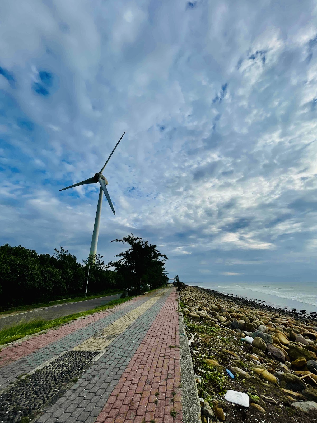 太陽很大,八月份,有防波塊和海浪,長堤可逛,風車因風速當天不大,擺動很小,不少外籍勞工和老人家也會來此散心、殺時間