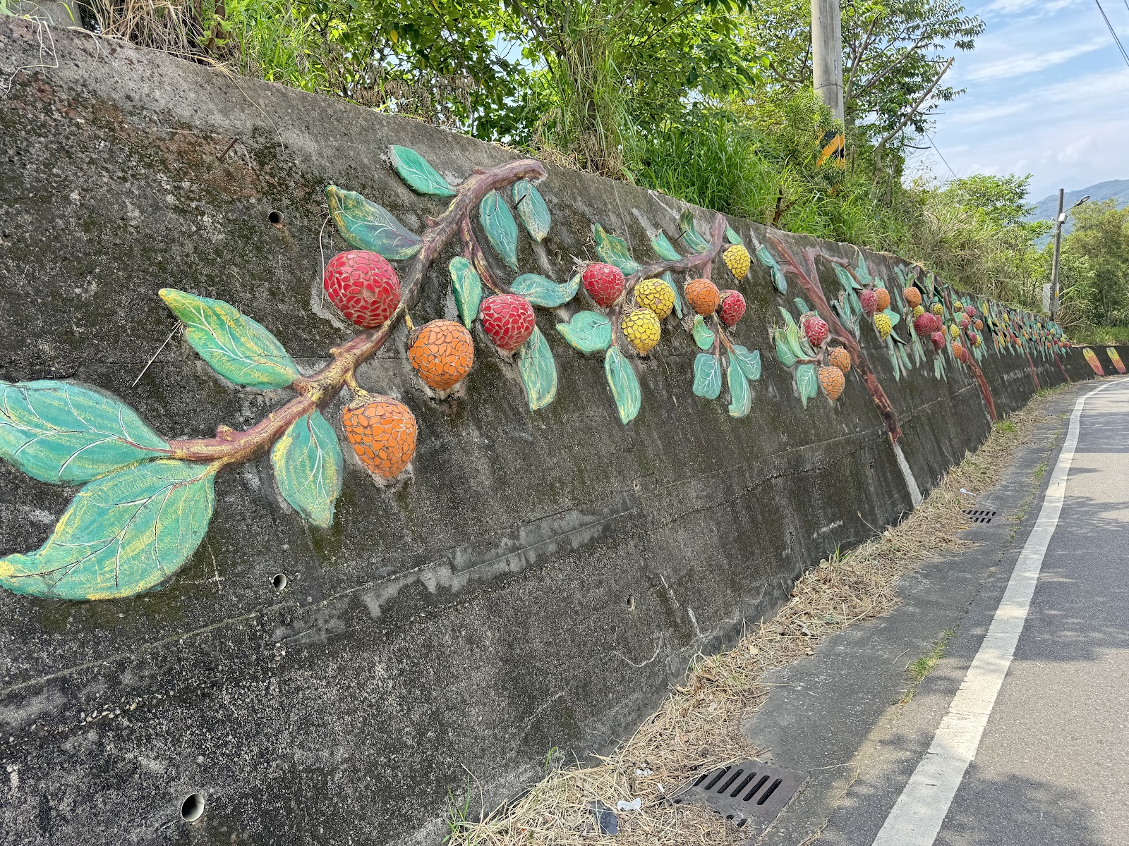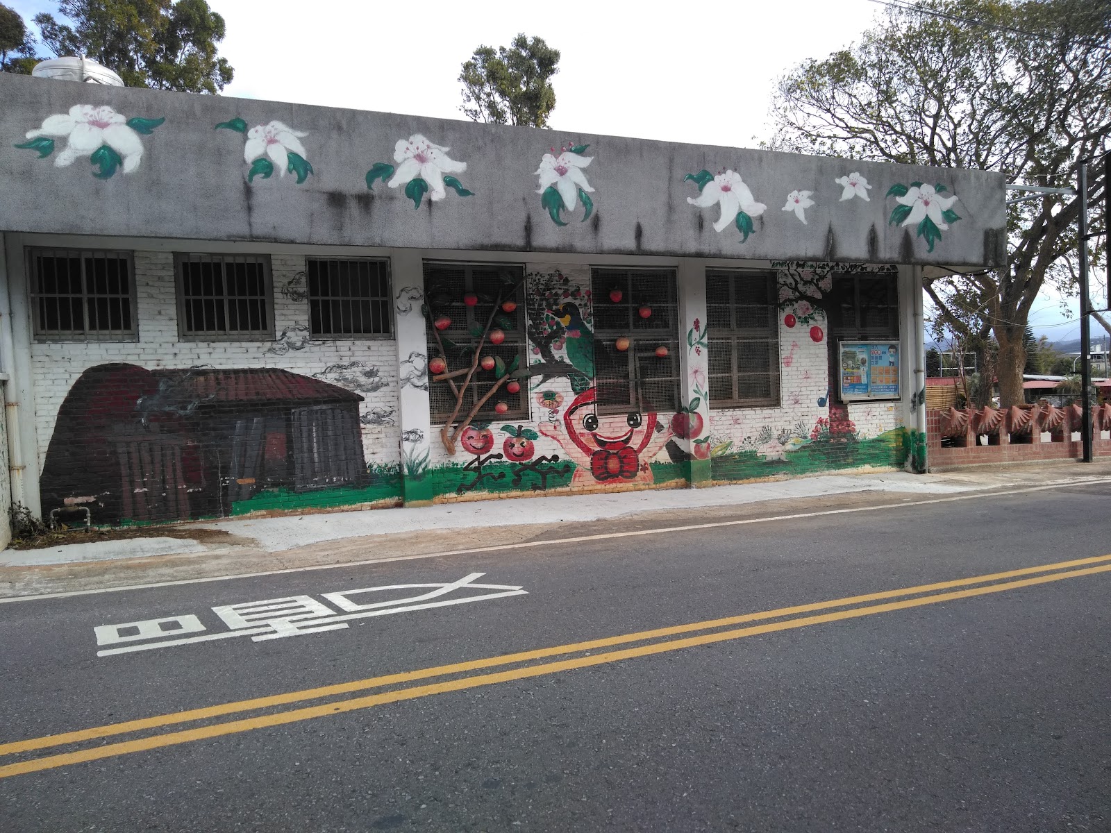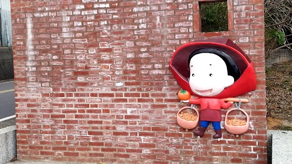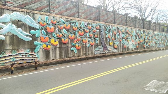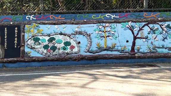 著名的網路靈異景點,反而掩蓋了社區活動中心,辛苦製作的彩繪雕塑墻。有搭配的客家俗諺,地方景點圖片,特色產物柿子荔枝等。