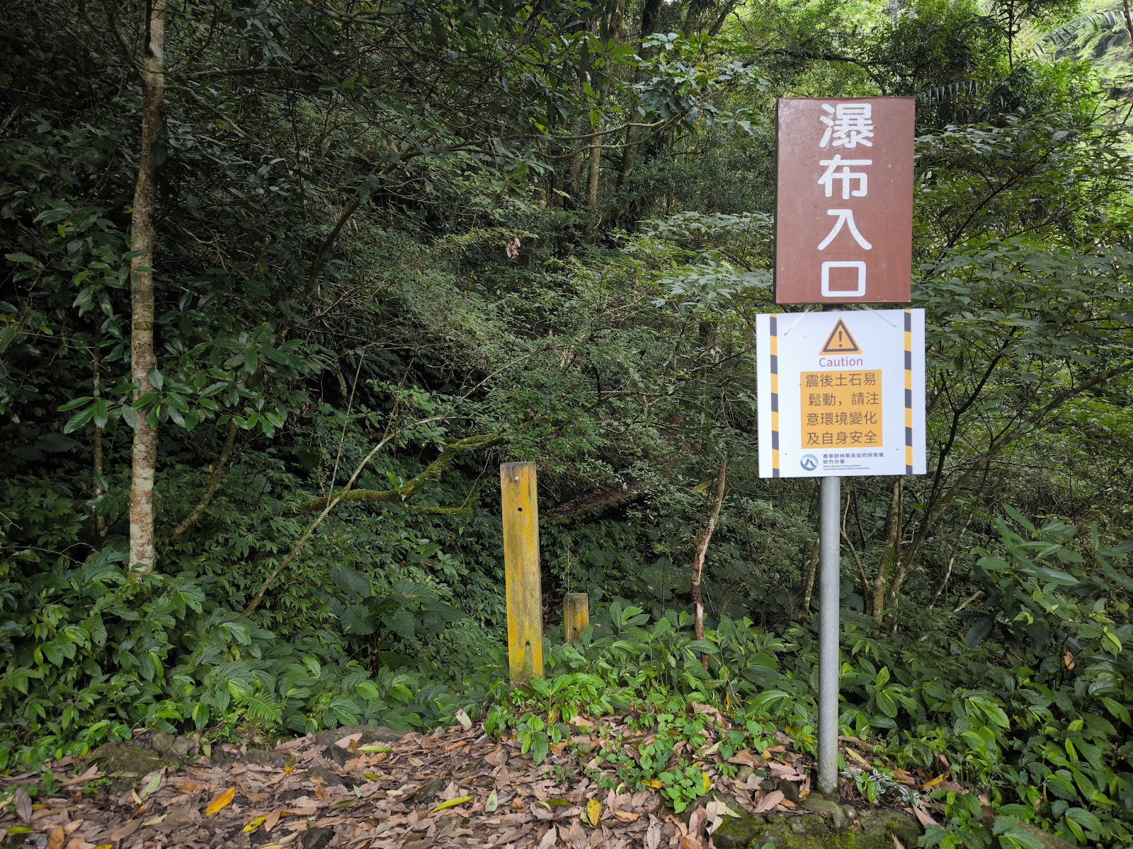 此入口進到瀑布還要走約30分鐘,前半90%路途平順,只是路面有落葉且溼滑要特別注意,沒有難度。後半最後的50公尺小徑需沿著山壁踩著樹根與碎石才能到達瀑布平台,雖然路程很短,但石頭溼滑且寬度僅能一人通行,不常爬山的人或沒穿運動鞋的要特別注意安全,需要手腳並用輔助攀爬。