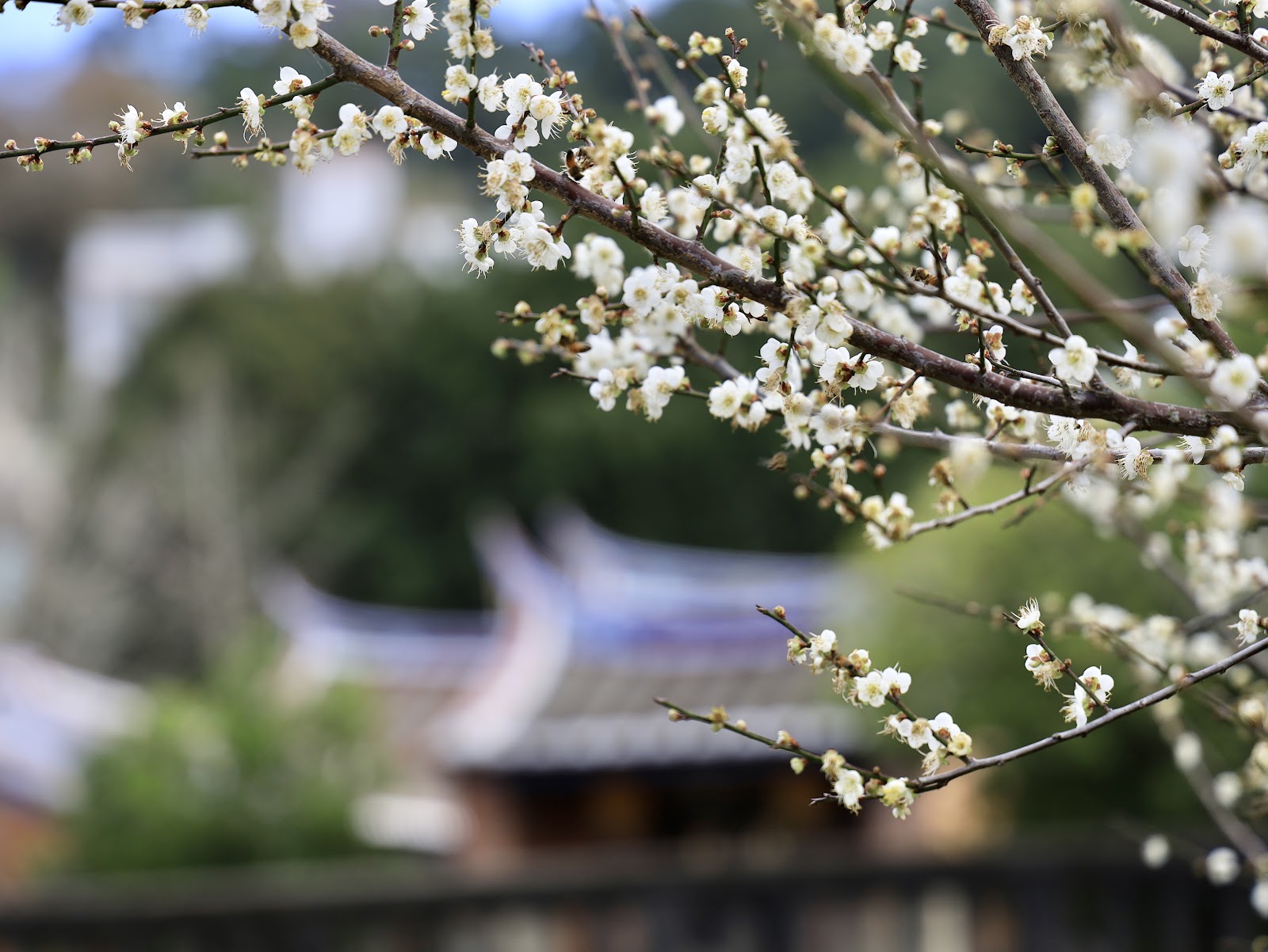 門口梅花遇冷盛開,建物古色古香。