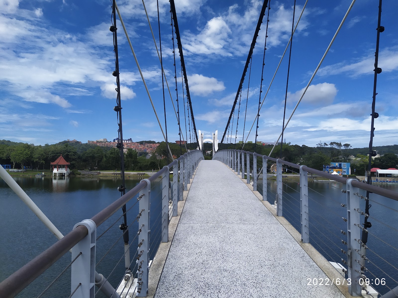 吊橋非常醒目,池邊還有休憩廣場,有水上的踩踏船。
