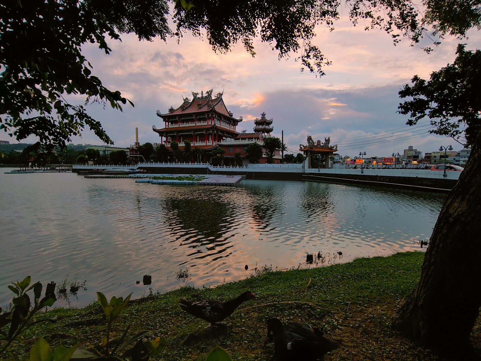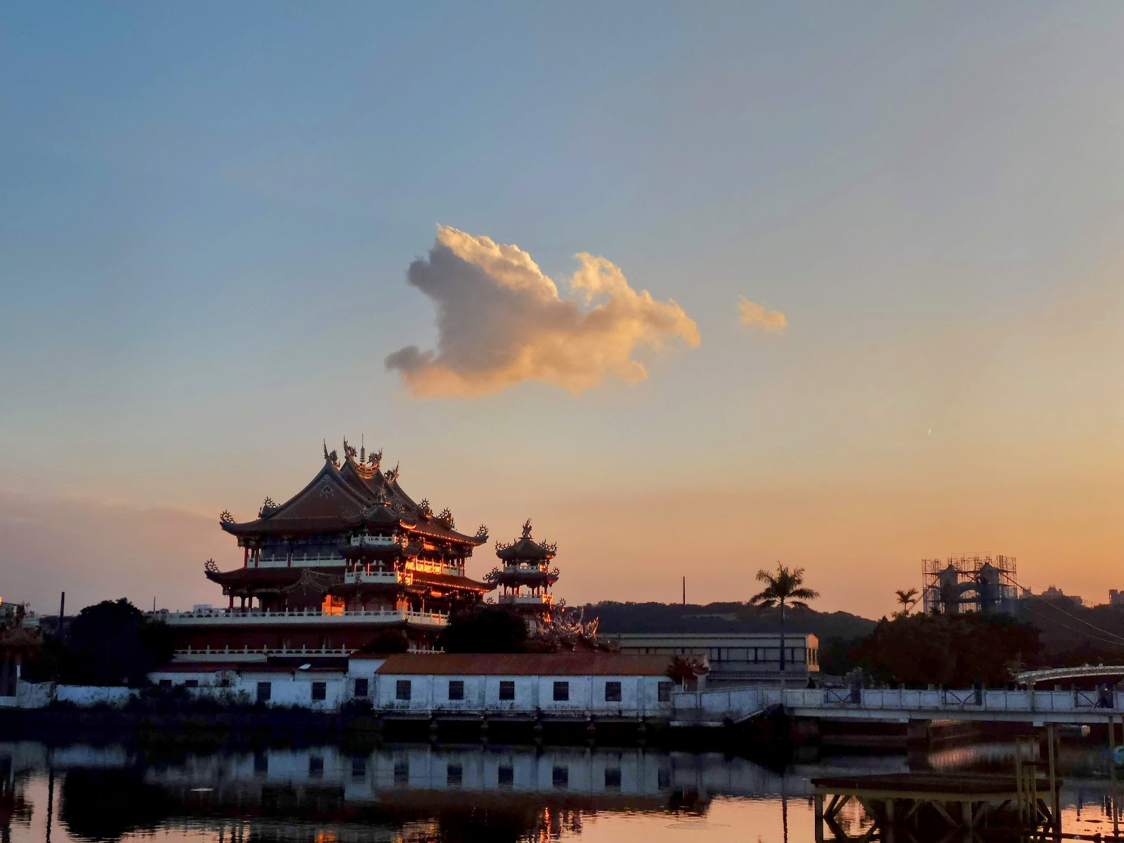 古色古香在龍潭大池內的廟宇,香客絡繹不絕,傍晚時刻在落日餘暉照映下相當棒