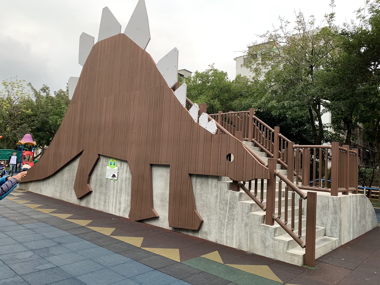 有一座「恐龍」磨石子溜滑梯,一邊是「劍龍」造型,另一邊是「三角龍」造型,小朋友一定超愛,另外還有塑膠溜滑梯與盪鞦韆可玩。矮牆處有恐龍圖騰,整個公園滿滿的恐龍元素,很有來到侏儸紀公園的氛圍~