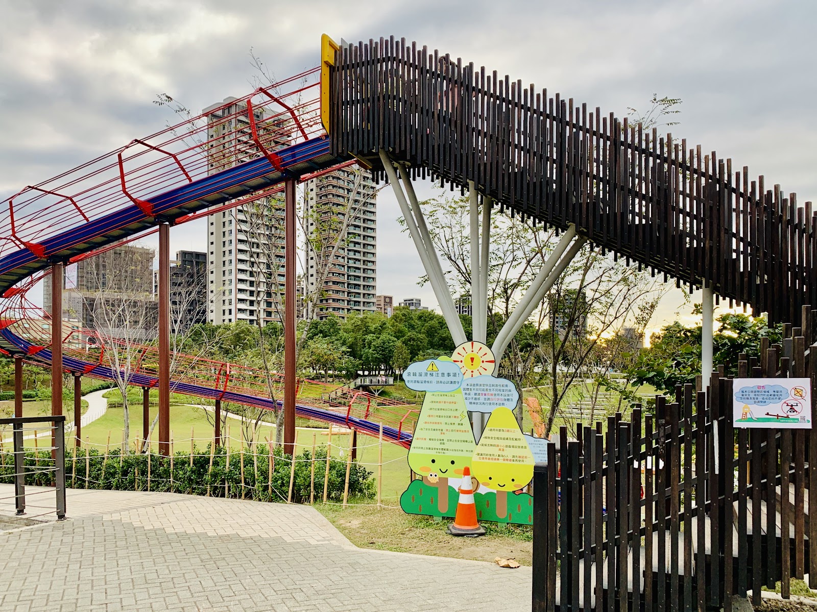 對比公園面積,廁所數量少而分散,溜滑梯區的親子廁所沒有嬰兒換尿布台(要到天幕建築辦公棟1樓男廁外/飲水機也是)或者是暫時性的安全座椅也沒有,只有輪椅扶手以及小馬桶,燈光暗的有點可怕,沒有衛生紙坐墊消毒液酒精洗手乳比較零散不齊全,看來這裡比較適合自備或者是大寶貝5歲Up,沒哺乳室,招牌軌道溜滑梯標示13歲以上才能玩很多人違規併溜,此區是一個下陷的窪地(蚊子多且兇猛)如果不用溜的除了略顯陡峭的樓梯外,就是環繞式步道才能夠下去(推著嬰兒推車的話必須如此)