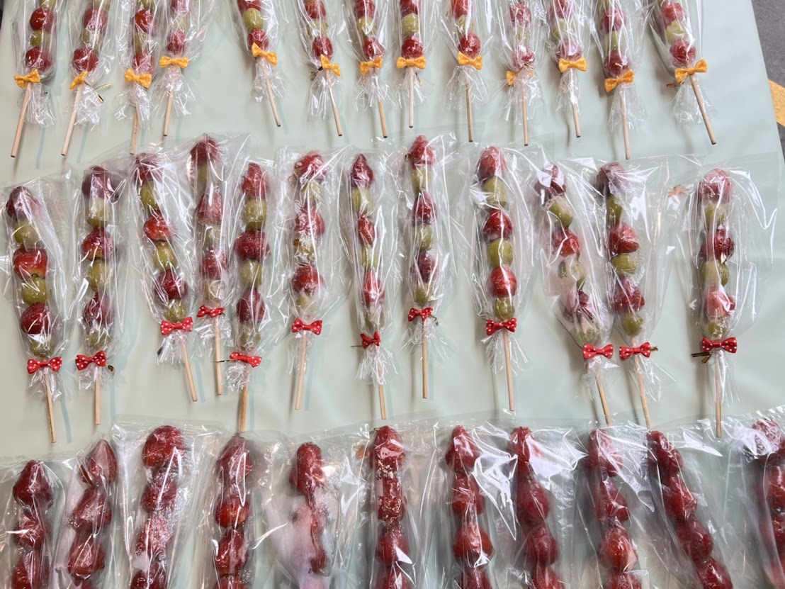 一堆水果的,有橘子綠葡萄蕃茄的那串,樣子鮮豔又好吃~很喜歡咬脆脆糖衣,很爽🤣