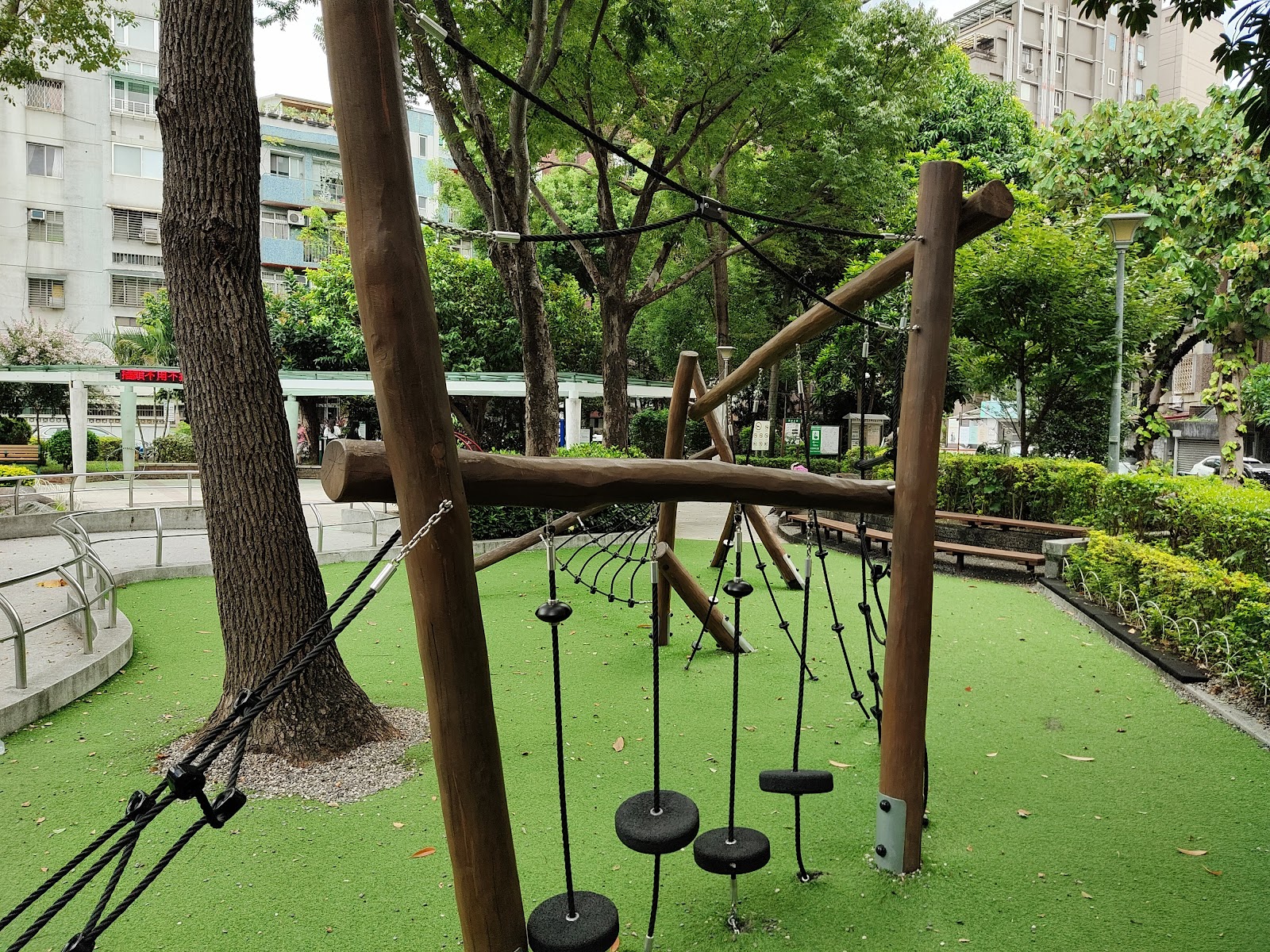 貓頭鷹旁有平衡木與攀爬網/架,有一段需要爬上繩梯後再走獨木橋到對面去,難度較高,適合學齡兒童。