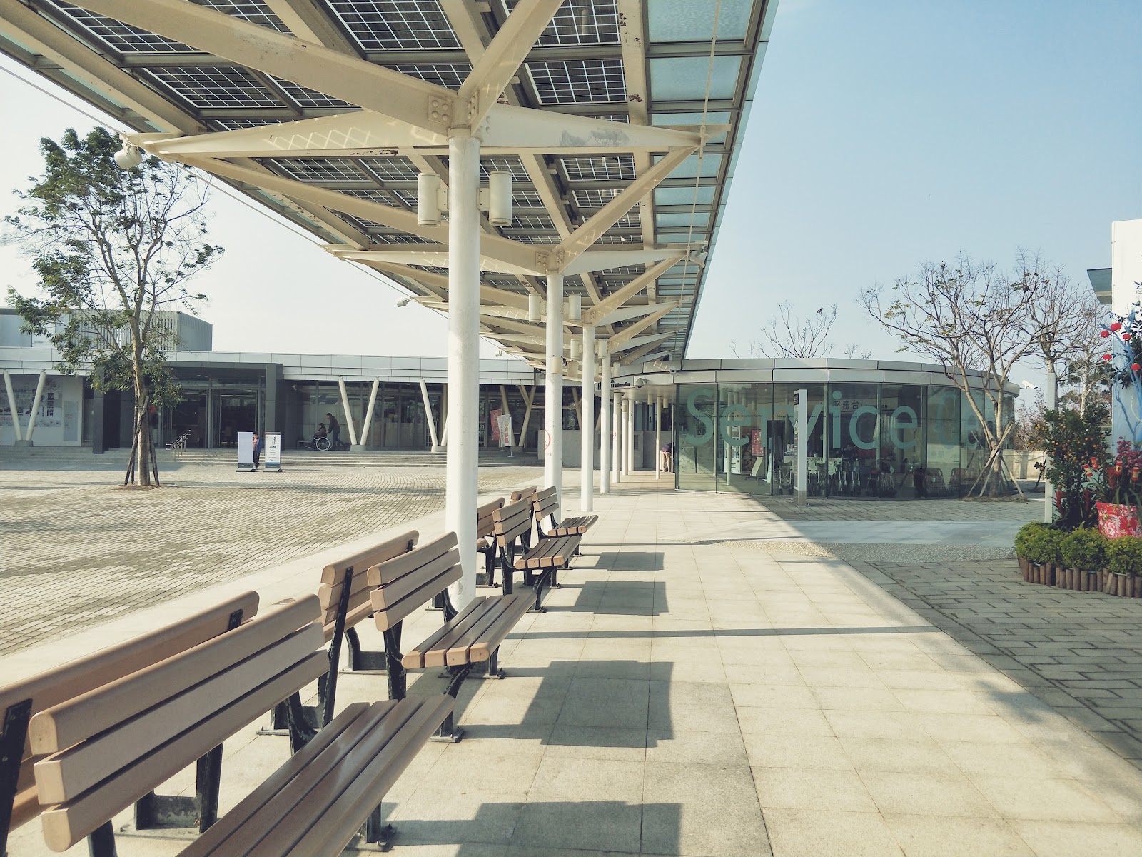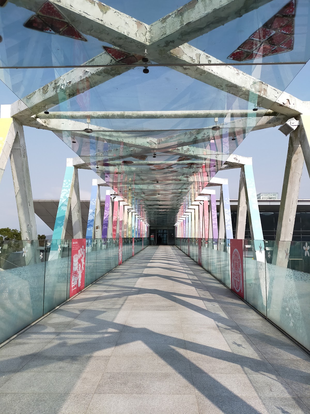 在入口處的服務台1(information service 1)附近,還有一間小坪數的購物空間,整體的無障礙設施與設計非常的完善,甚少看見如此完善的無障礙環境,所以,不方便的民眾,可以在乘坐輪椅來此參觀。入口停車收費採取一次性收費50元,有導引人員協助指引。也有免費停車場的指標指引,只是離客家園區距離有一點遠。入口的空中樓廊道很簡潔舒暢,由此進入到客家園區室內的地方。