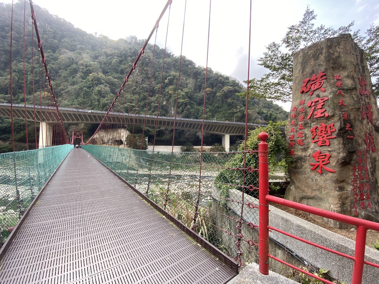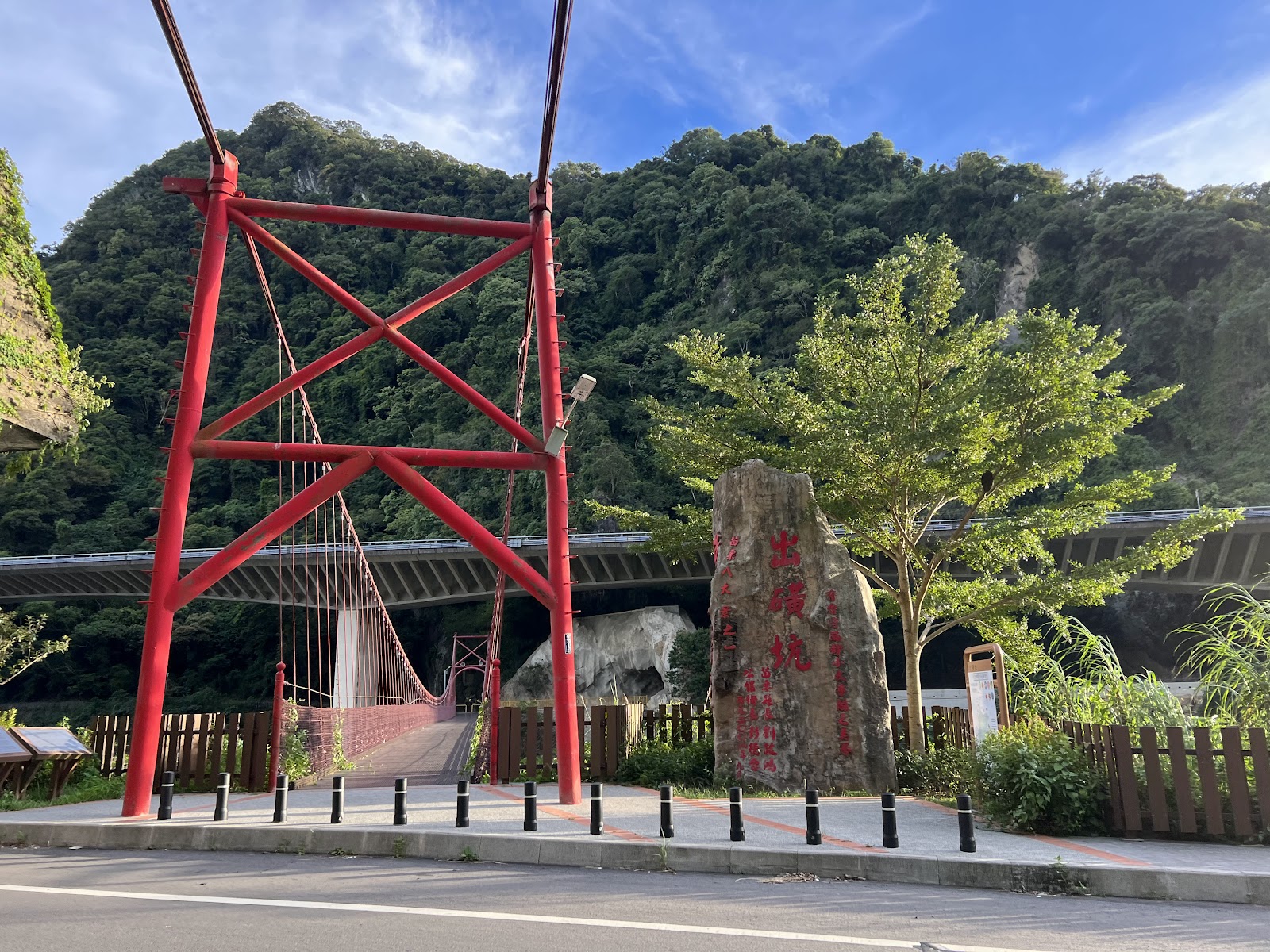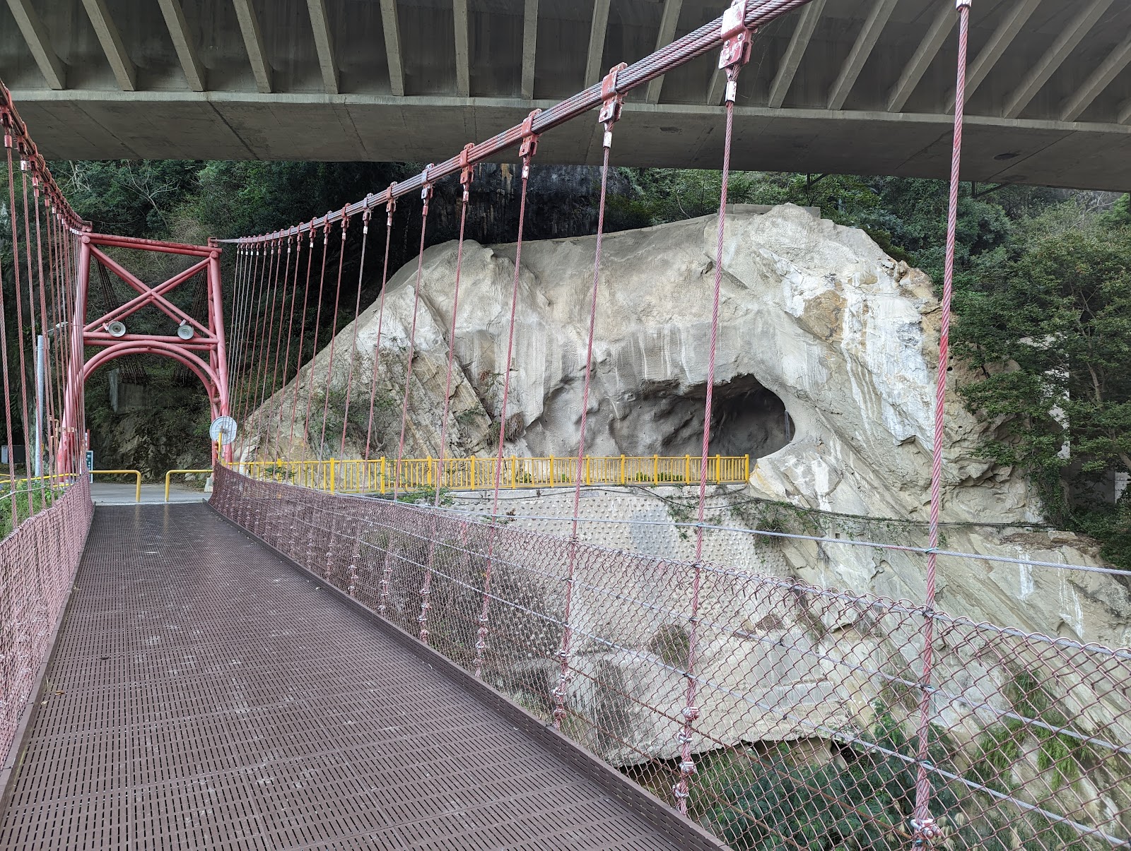 出磺坑吊橋南側隱沒在72快速道路底下,一旁還有為了開通道路而開鑿出來的山洞,真的符合小太魯閣的美名,集結早期對外交通的吊橋、大自然鬼斧神工的山洞,以及當代為了快速交通而建立的快速道路,三位一體,站立其中頗有穿越時空的詩意。