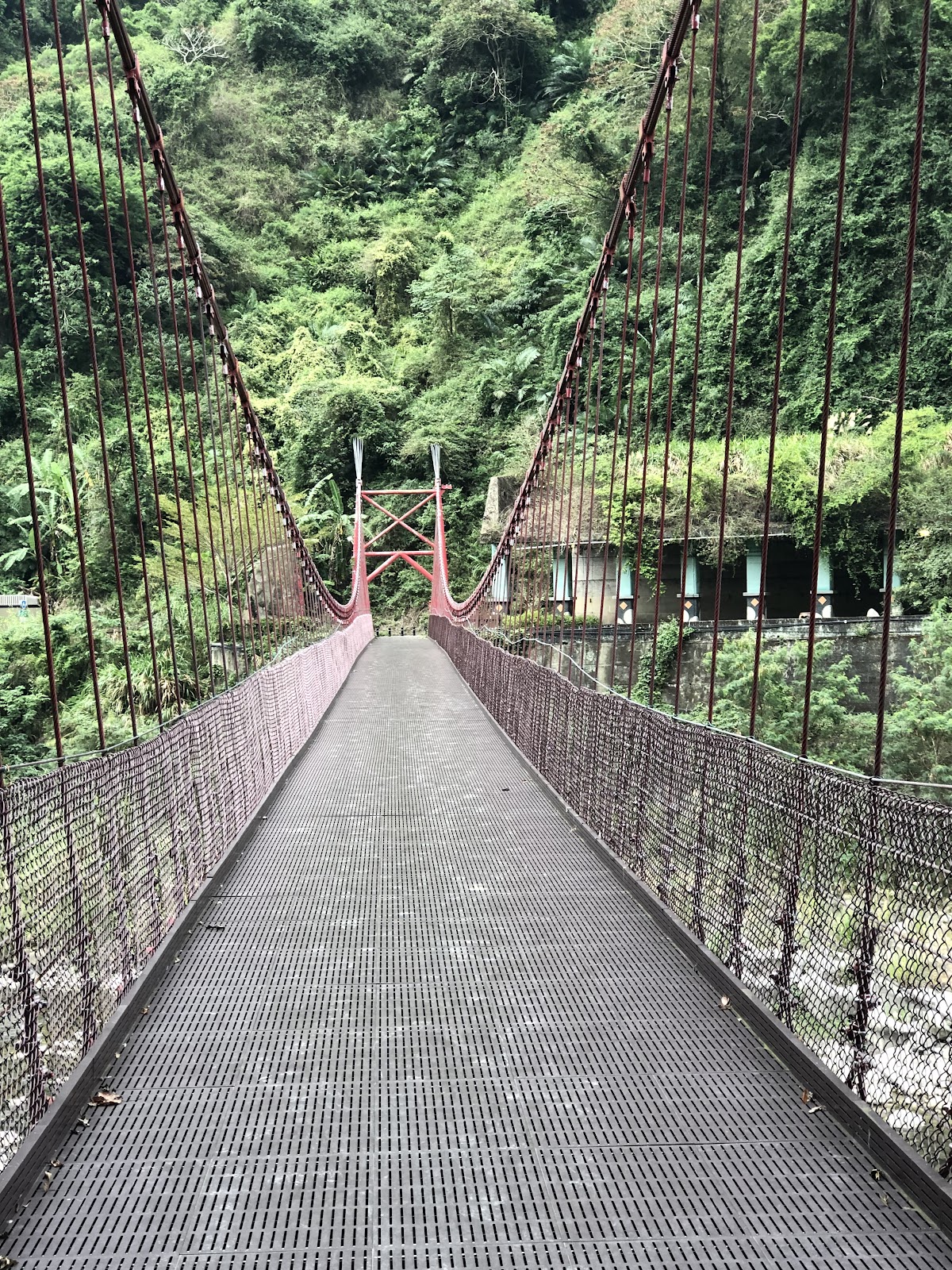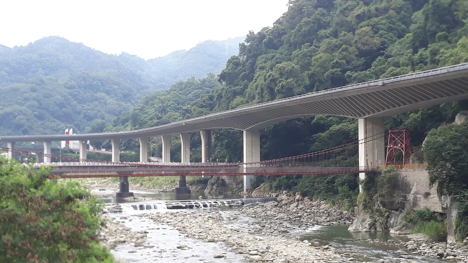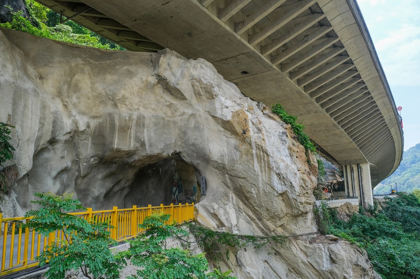 出磺坑吊橋南側隱沒在72快速道路底下,一旁還有為了開通道路而開鑿出來的山洞,真的符合小太魯閣的美名,集結早期對外交通的吊橋、大自然鬼斧神工的山洞,以及當代為了快速交通而建立的快速道路,三位一體,站立其中頗有穿越時空的詩意。