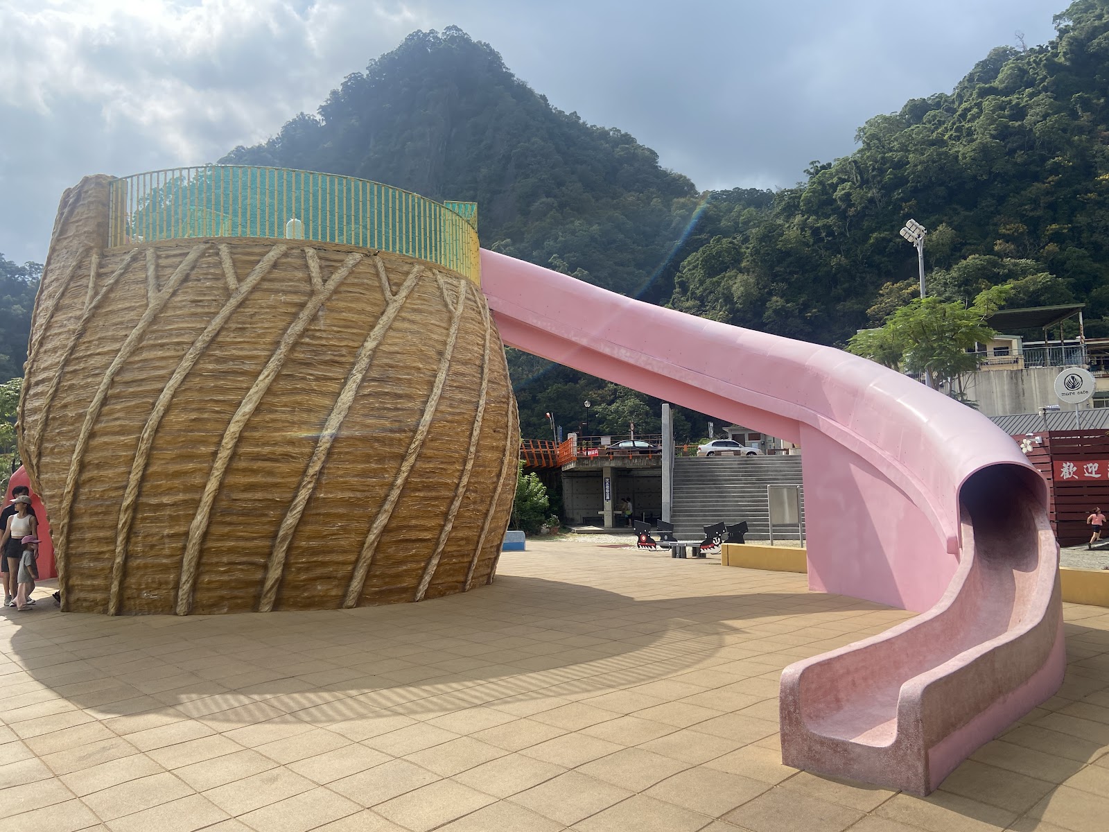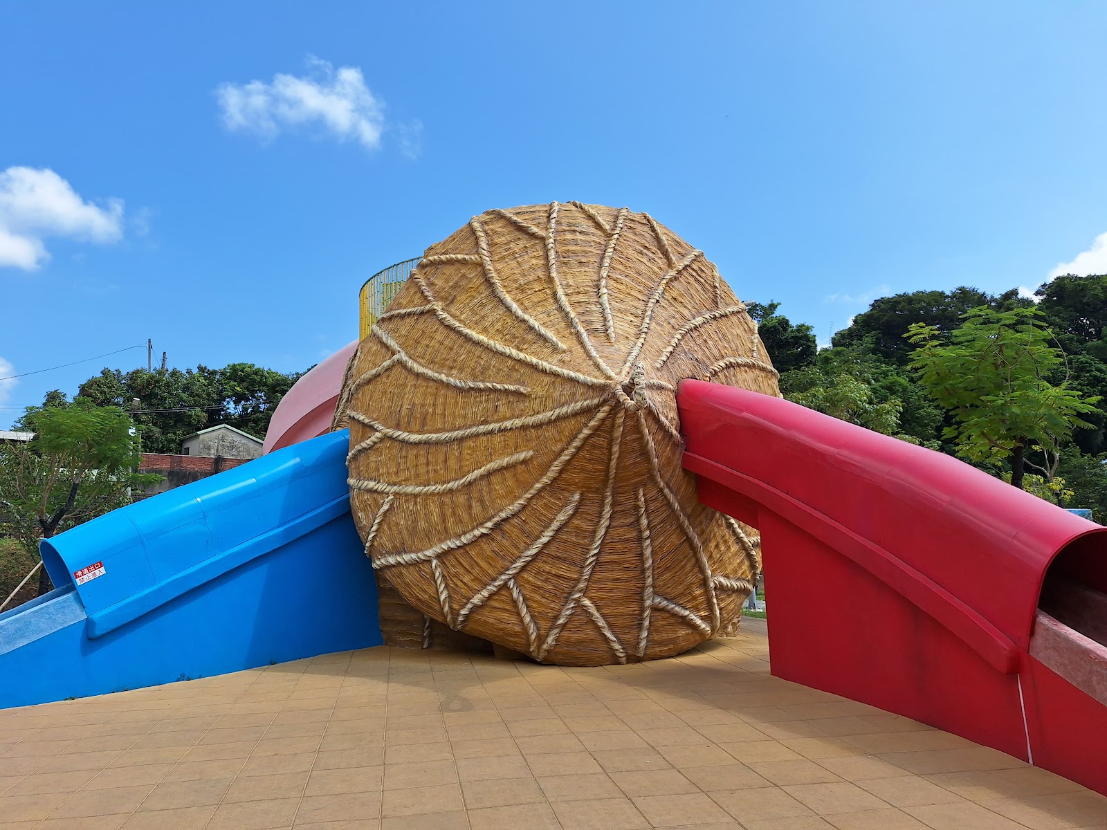 溜滑梯的造型很有農村風,假日去時旁邊步道有自助小攤商賣飲品、麻糬及小遊戲。