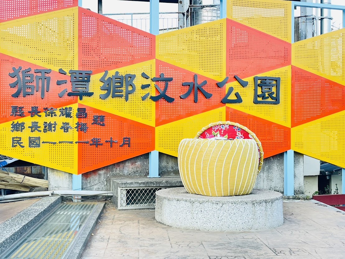 不知道是不是中秋連假的關係,行人較少,沒有商業氣息的老街,猶如阿嬤家附近的主要幹道(車比人多?),寫著「獅潭汶水老街」的石板欄杆上還曬著在地居民的被子,非常接地氣。老街中間有派出所和兩津進駐,想必治安一定很好。可以開車來(有停車場、輪胎行),可以騎摩托車來(有機車行),香腸攤販有賣草莓香腸,還有幾家客家小吃攤,看起來應該可以找到傳統的味道,斗笠造型溜滑梯融合客家元素,非常童趣。