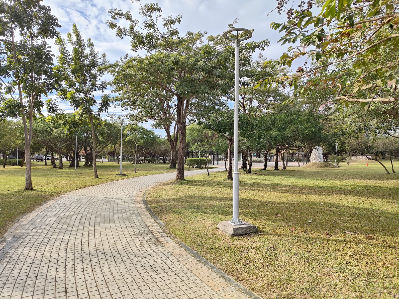 這個公園很多元,樹非常多,是台中寵物友善公園,門口也是晚上的跳舞團聚會公園,附近有星巴克、藏壽司、夾娃娃,中央公園外圍,一旁是垃圾場,會有味道。