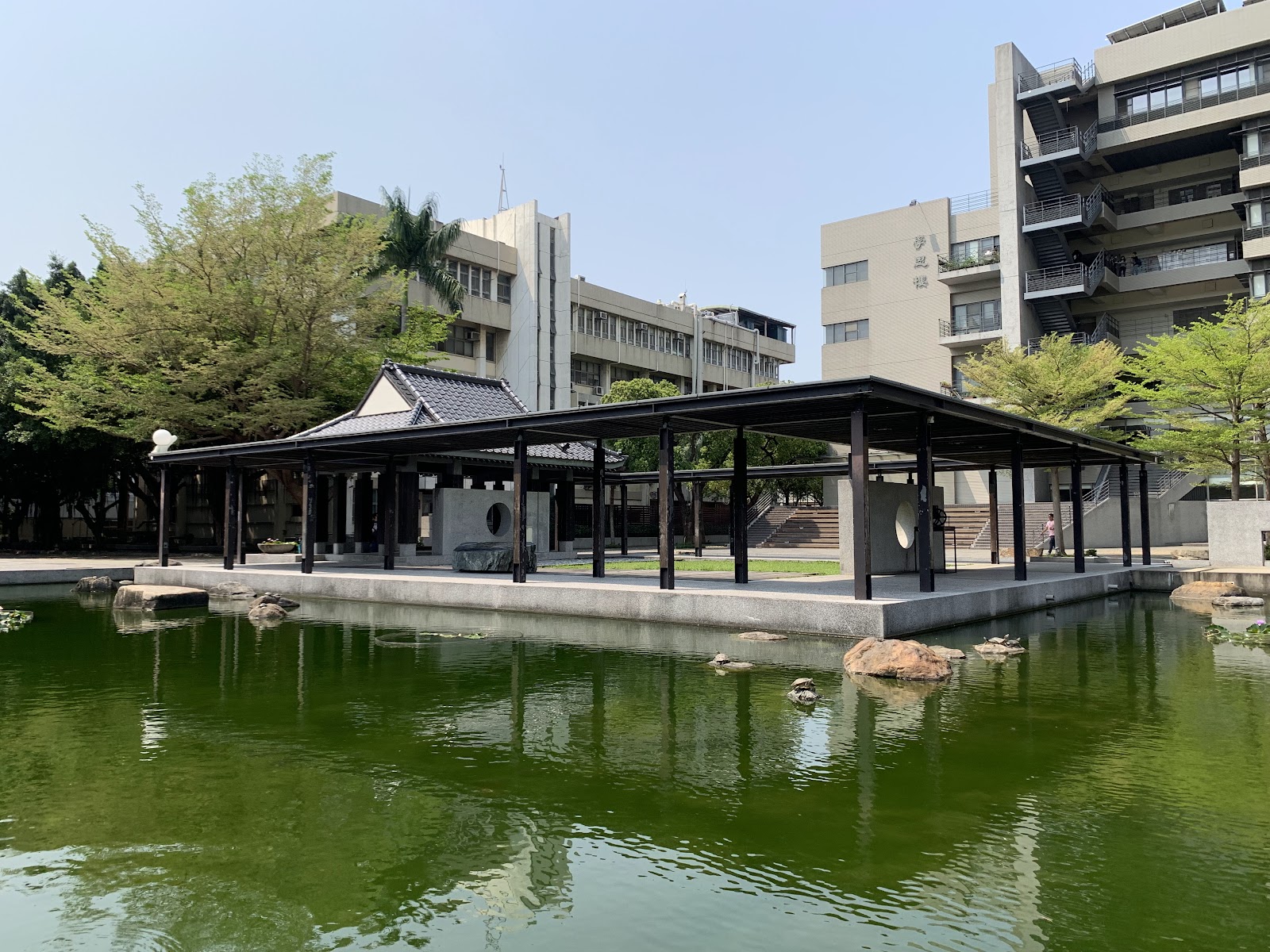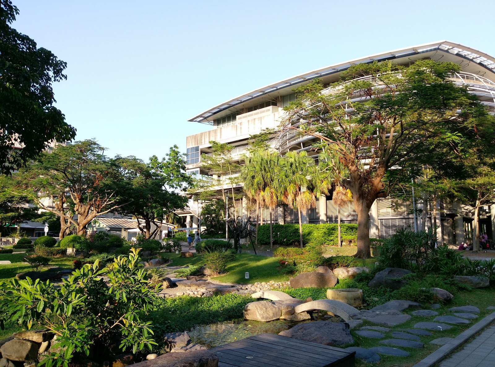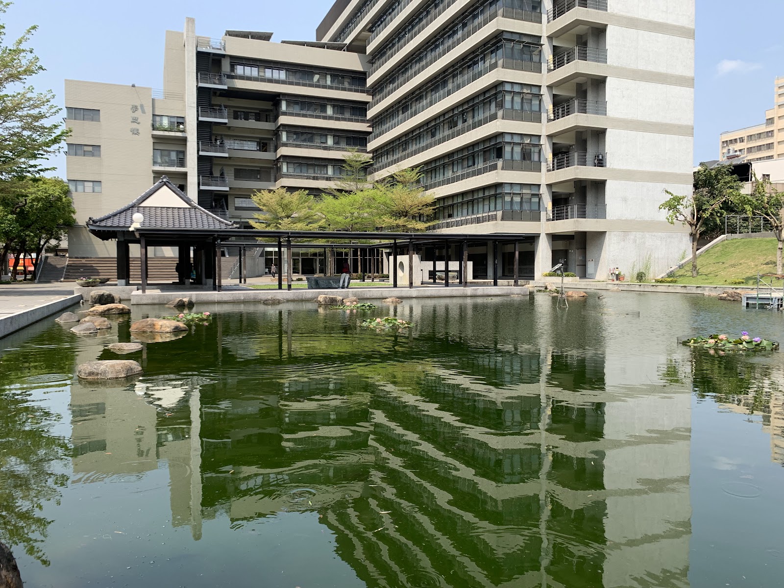 學校內一個特別的小公園,有著中式復古的涼亭、生態池塘、小橋流水,是適合拍照或坐下來休息的地方,如果旁邊的體育館舉辦動漫同人誌展時,這裡也是COSPLAY玩家熱門的拍照取景地點。