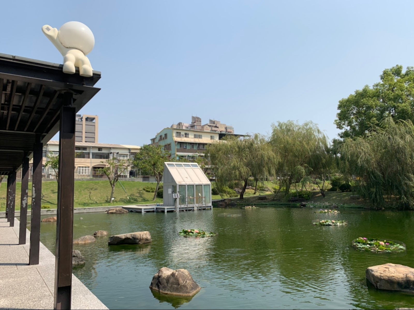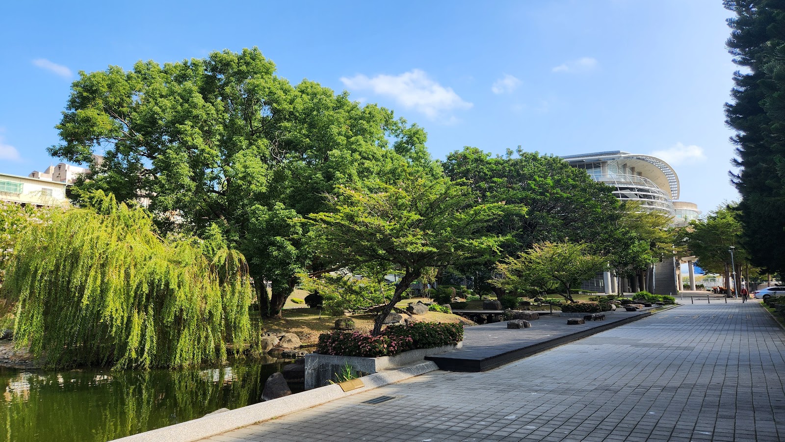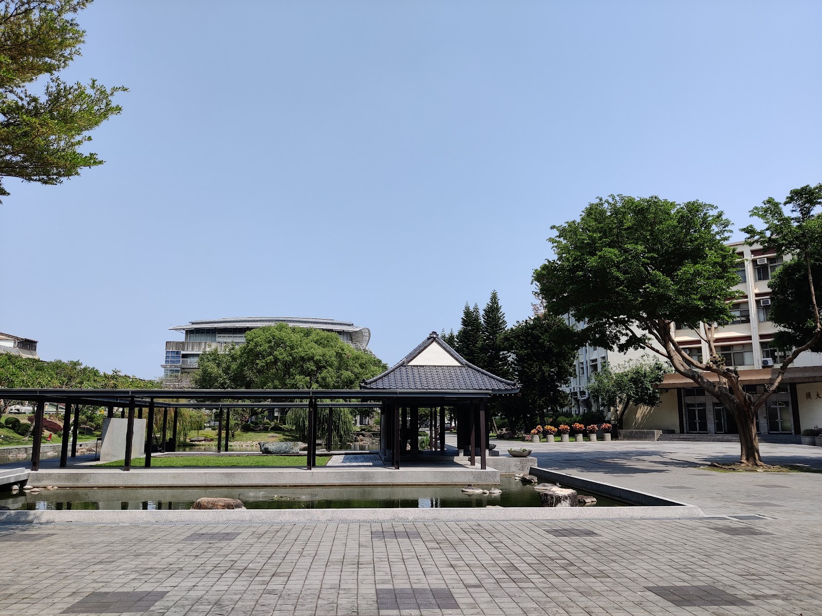 學校內一個特別的小公園,有著中式復古的涼亭、生態池塘、小橋流水,是適合拍照或坐下來休息的地方,如果旁邊的體育館舉辦動漫同人誌展時,這裡也是COSPLAY玩家熱門的拍照取景地點。
