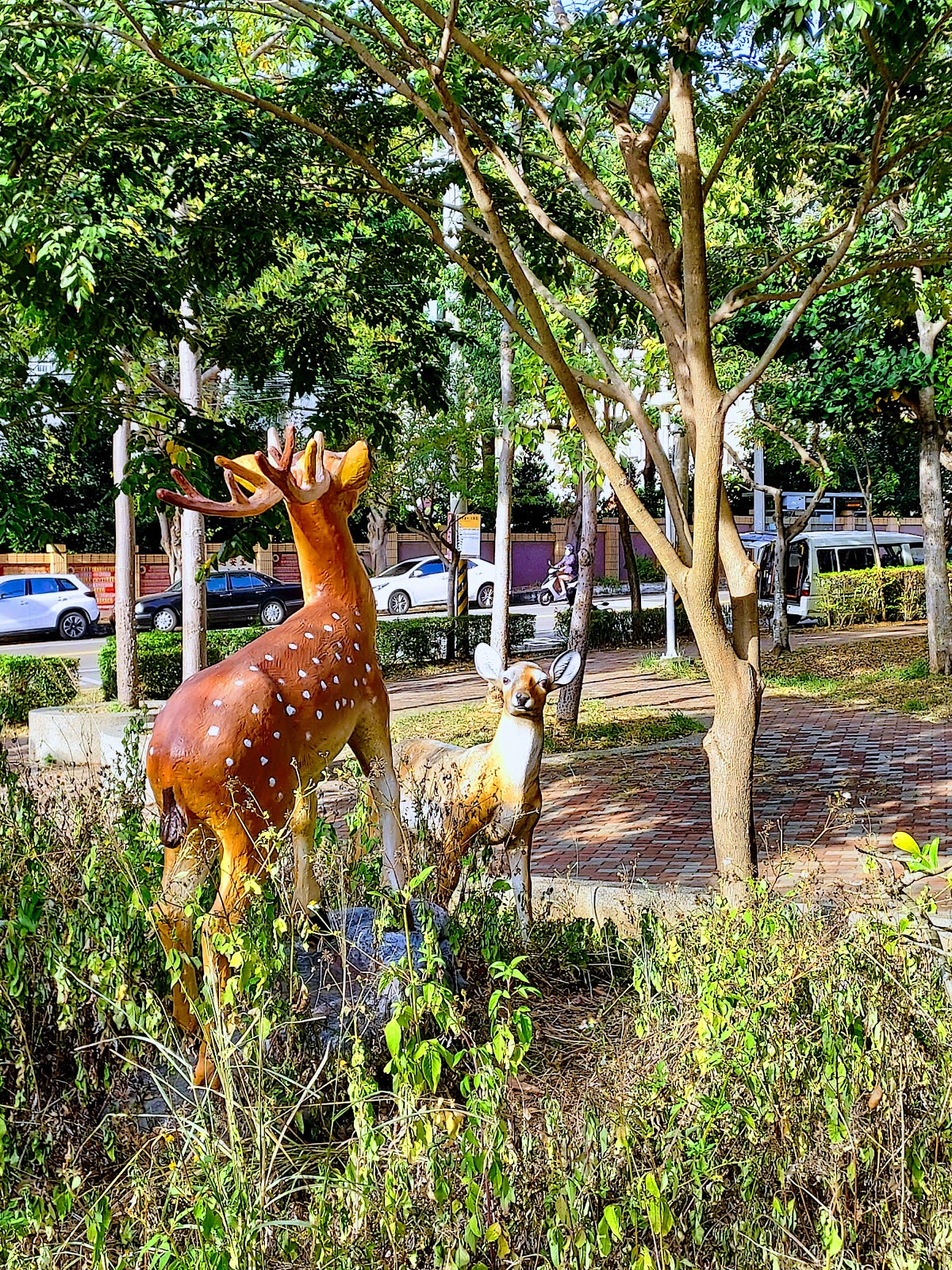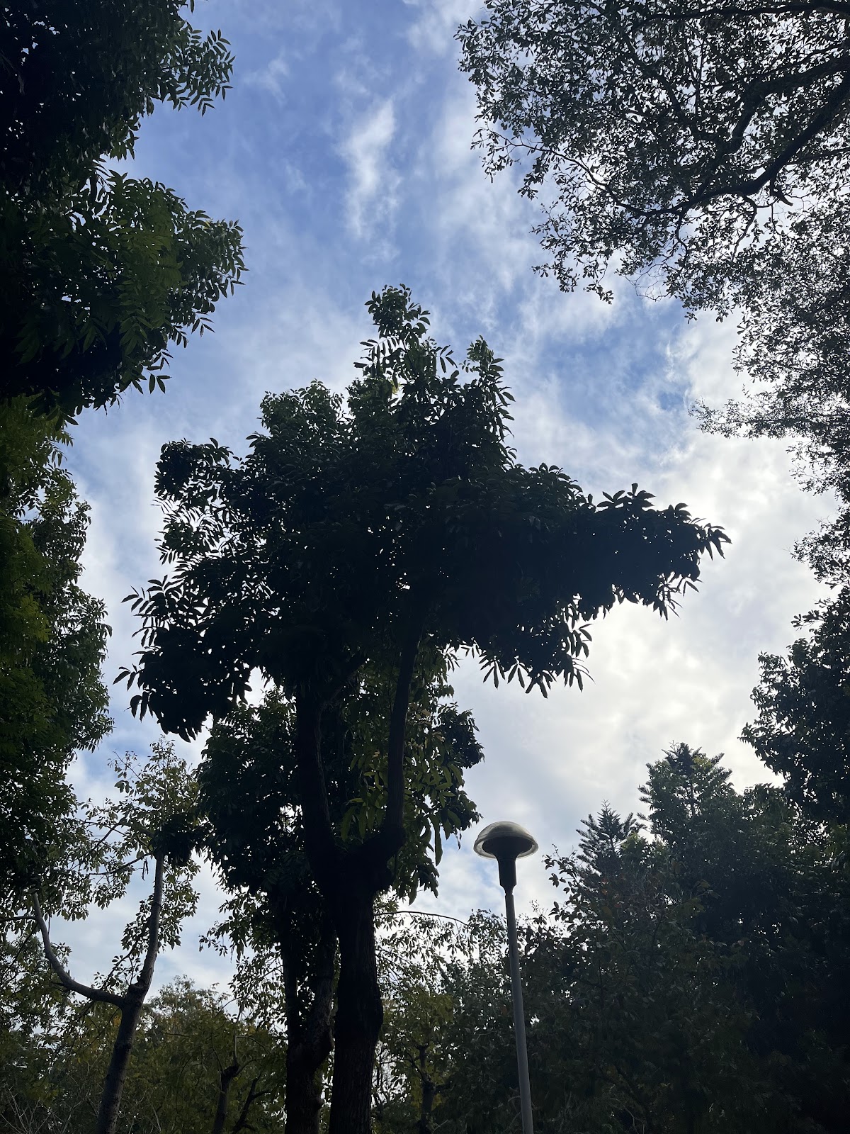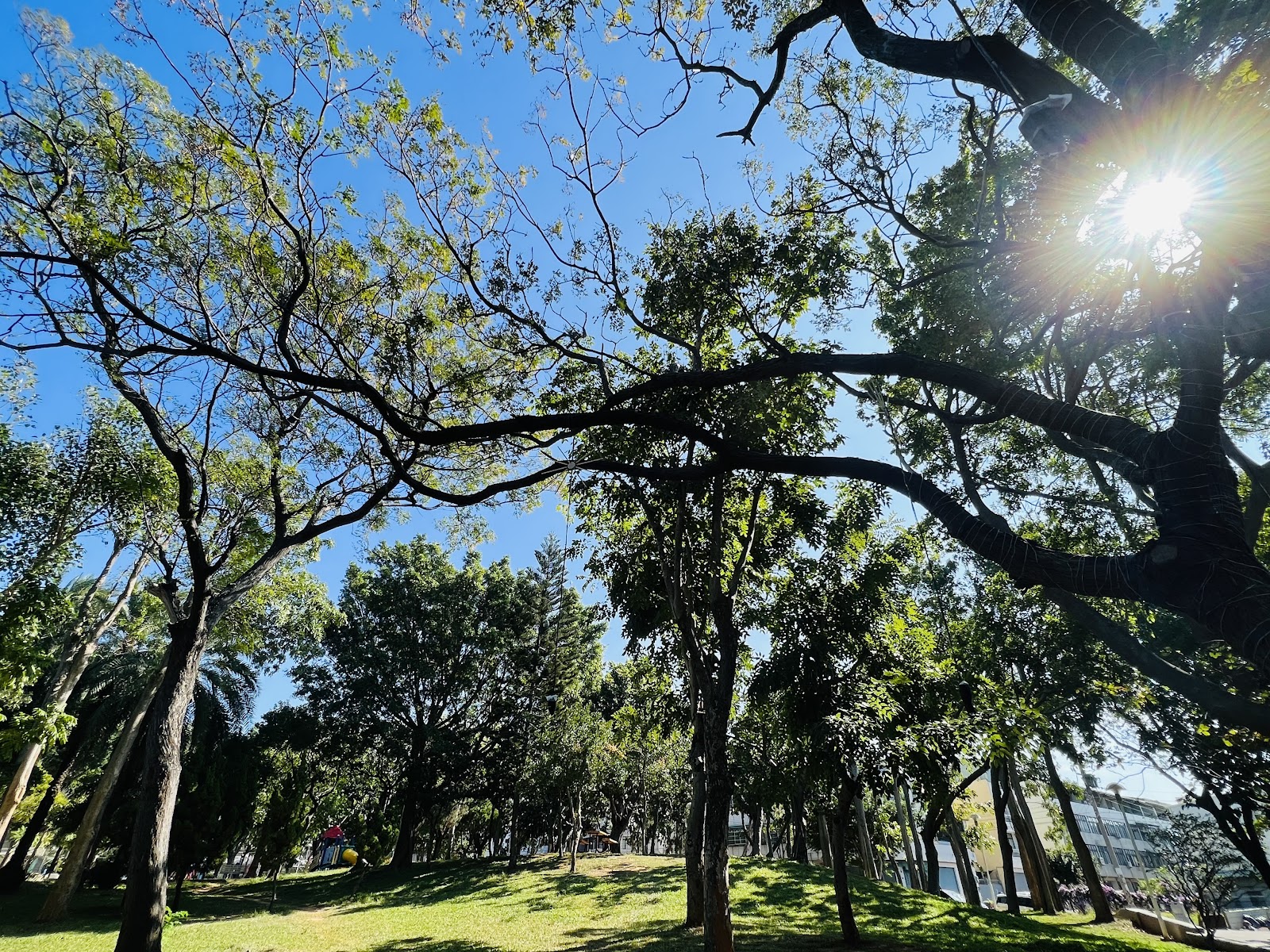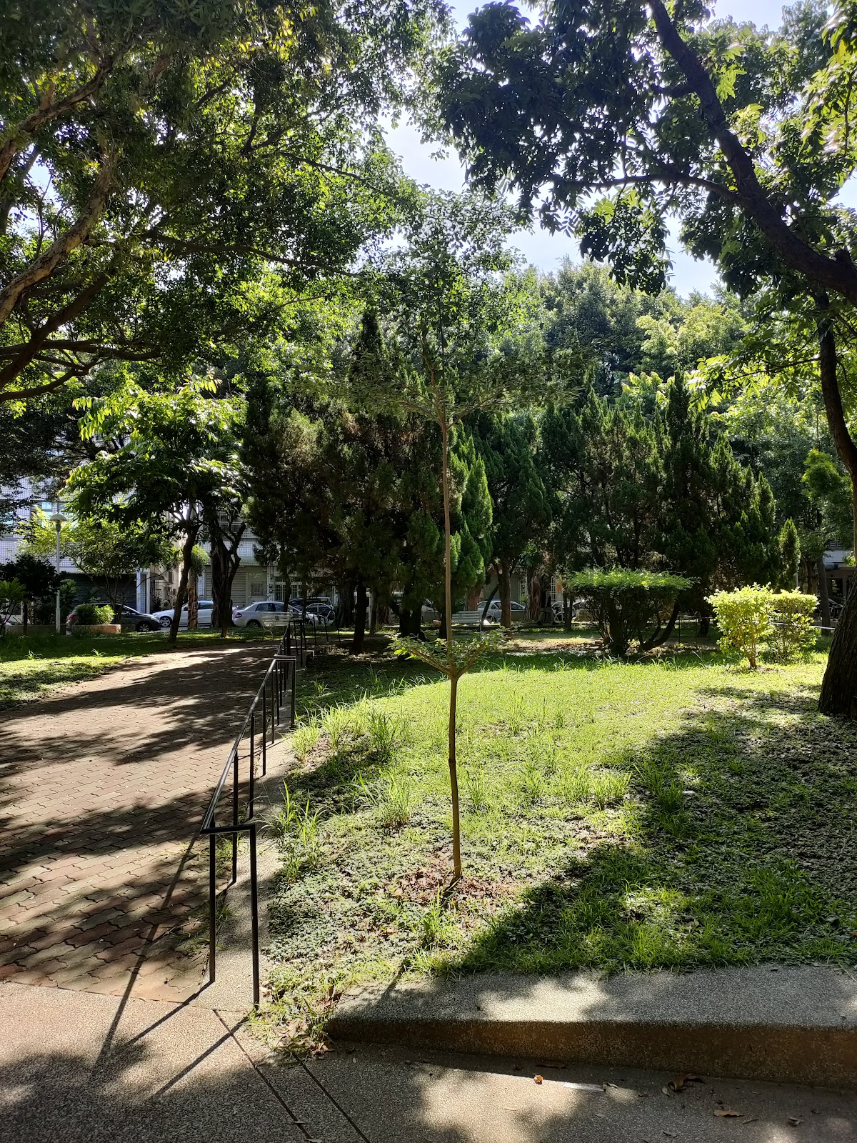 天氣晴朗舒服,這裡的樹木都蠻巨大高聳,路面有山坡草坪造景,視野不錯。