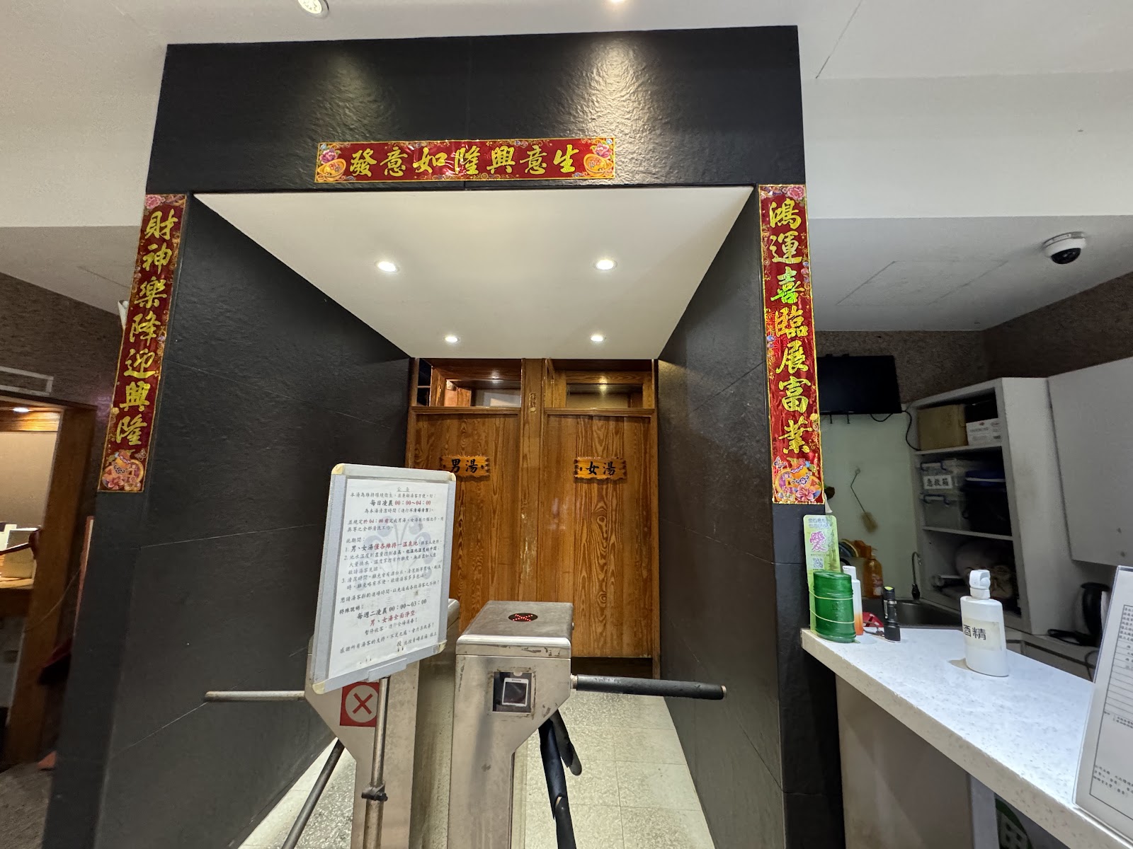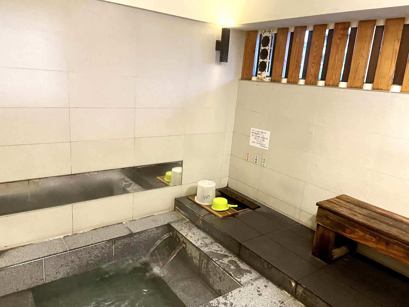 一進門右邊是接待櫃檯,有大眾池、個人湯屋、魚池泡腳等,這次選擇大眾池$150/人。結完帳櫃檯人員會給入場券,掃門口的感應即可入場,推開女湯門右手邊是層架最下層放鞋子,上層放衣物行囊,旁邊就是沖澡的裡面有一間廁所。裡面都是媽嬤字輩的大姐們,大家都會固定來此地泡湯,大姐分享青磺泉能舒緩筋骨,下班後來能一解疲憊。水溫很夠,還有冷水池,⚠️記得補水!下水前記得要沖腳喔~