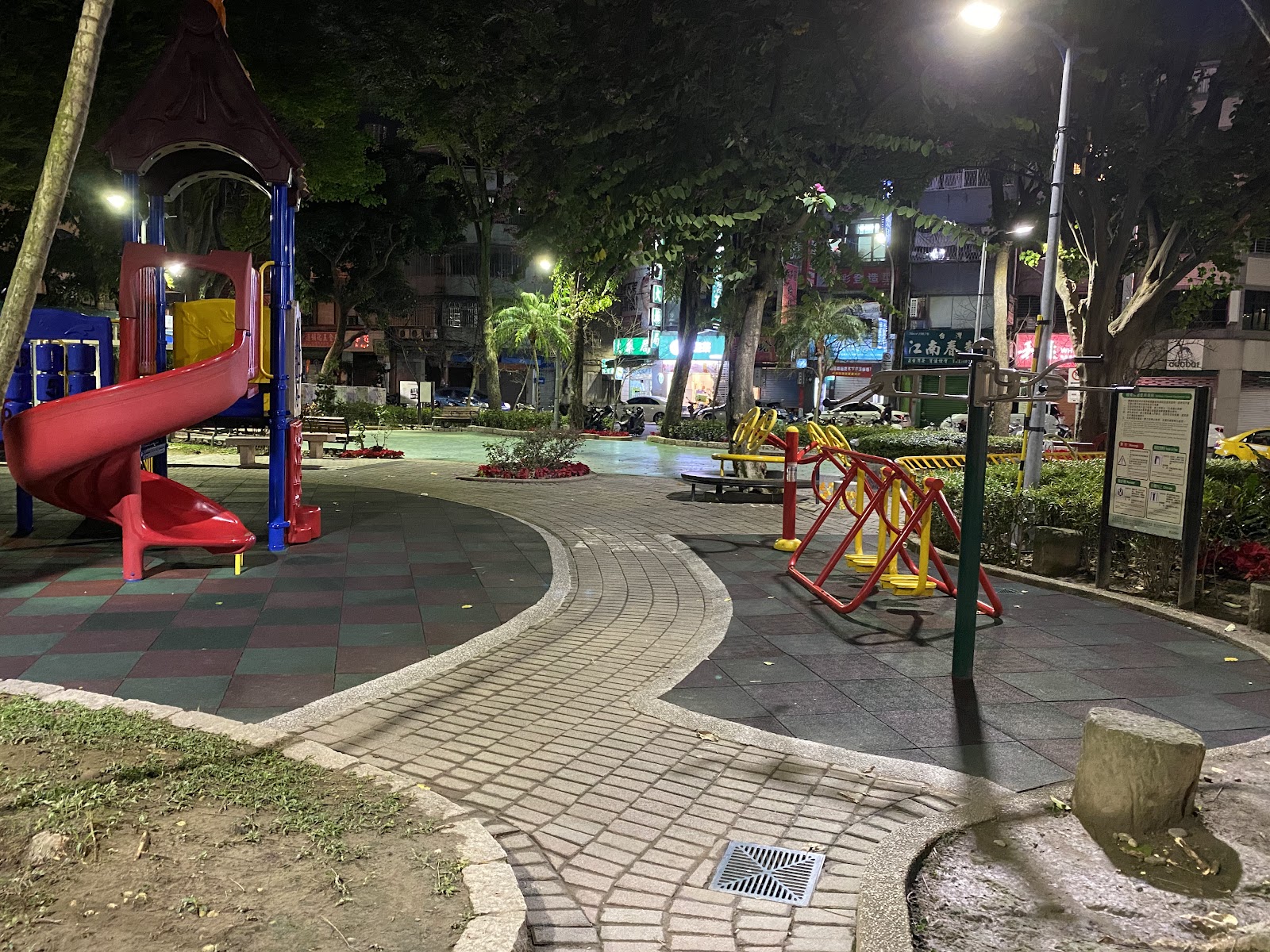 🌴公園內有兒童安全遊戲器材:溜滑梯區。有18歲以上者使用的漫步機、肩關節康復器等器材。
