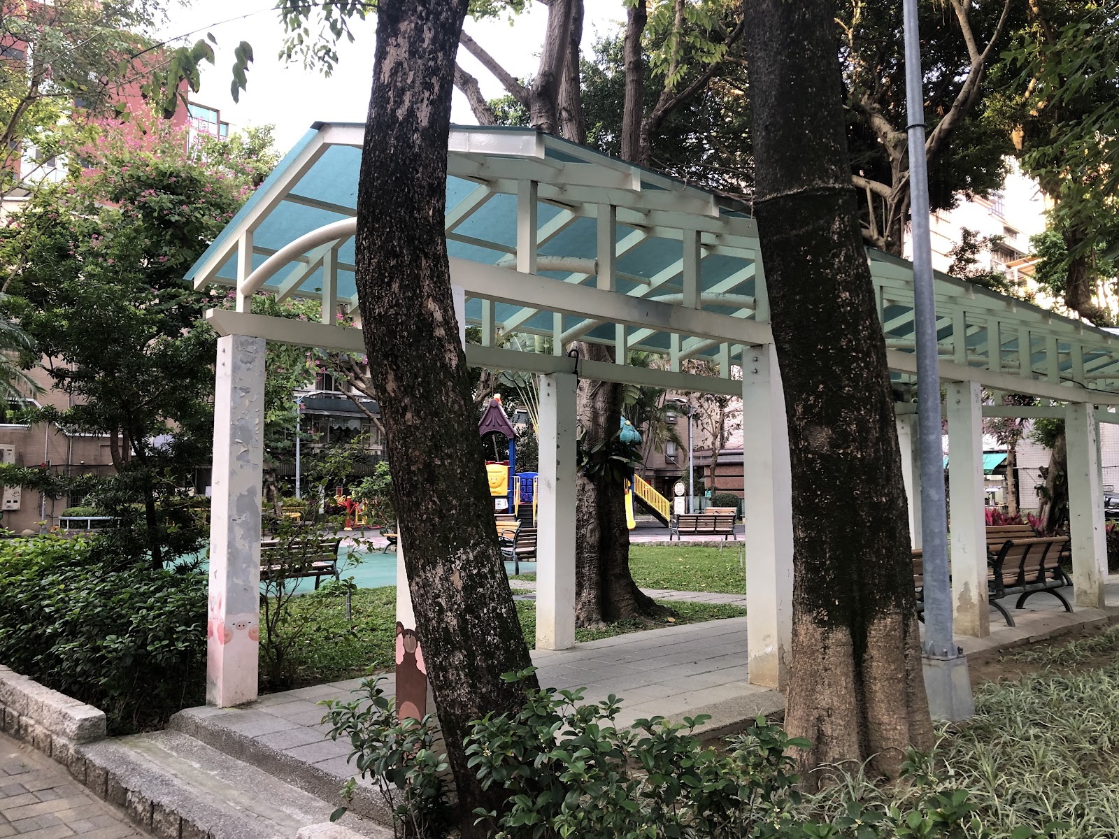 裡面有溜滑梯、涼亭,可以玩耍、休息。