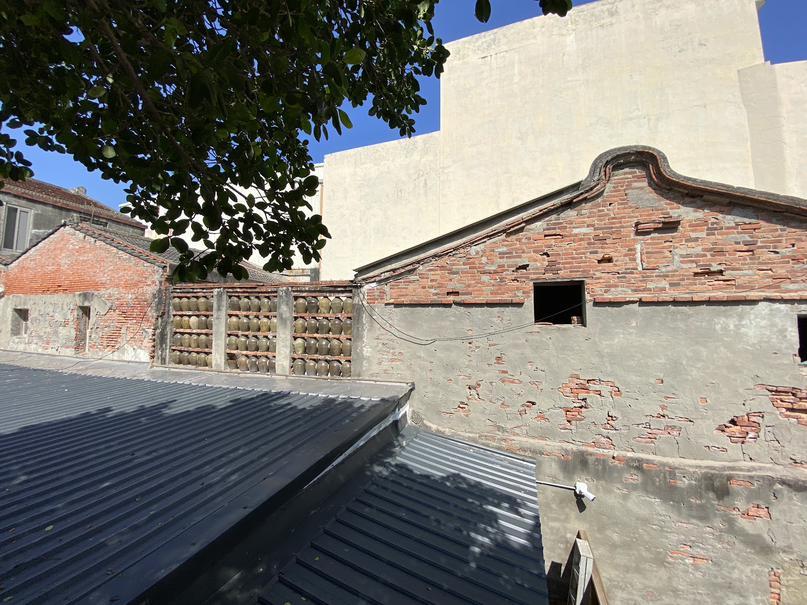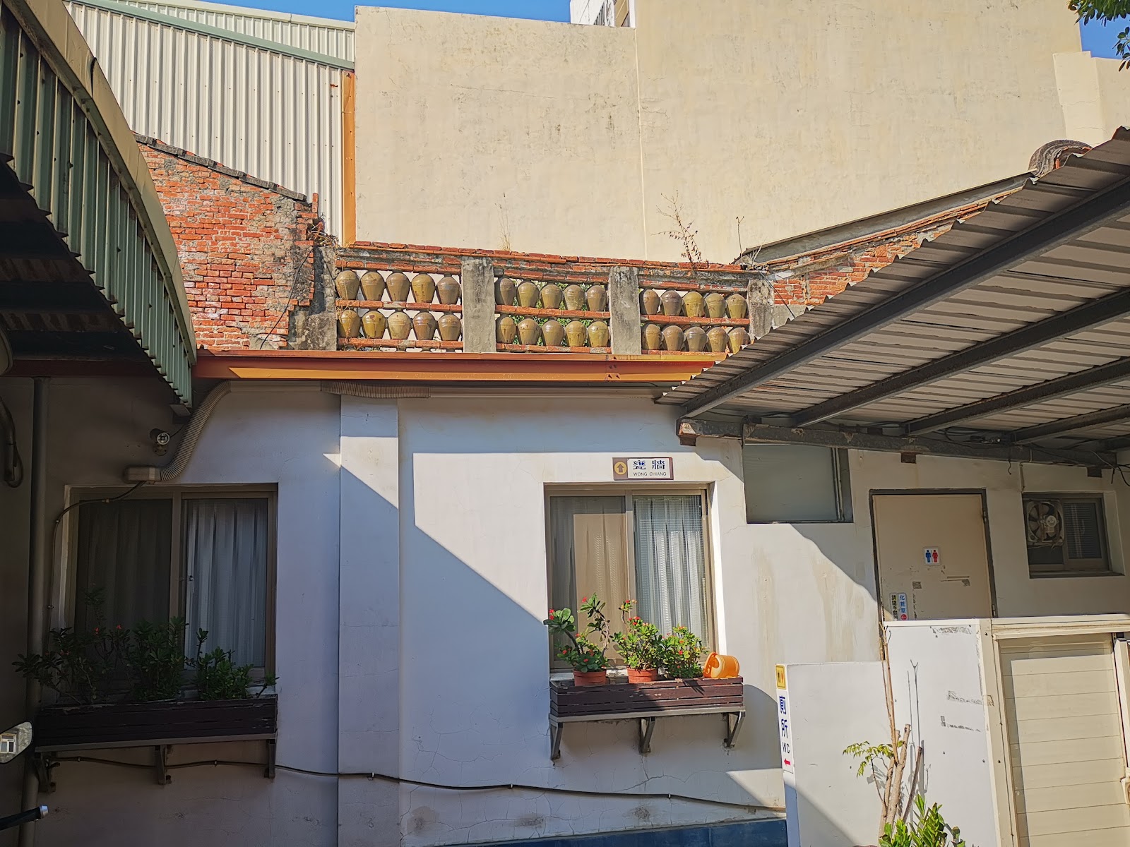 備註:今天老公的同學們18位,來鹿港ㄧ遊。和興青創基地,已歇業,外面建築還在。甕牆,有著以120個酒甕所堆砌而成的甕牆,為目前遺留下最龐大的甕牆古蹟。早期建築匠師,將空紹興酒甕應用作圍牆裝,發揮材料特性美觀有趣,是一種上乘創意現尚遺留多處。看到有些有破損,不知道還可以撐幾次地震?