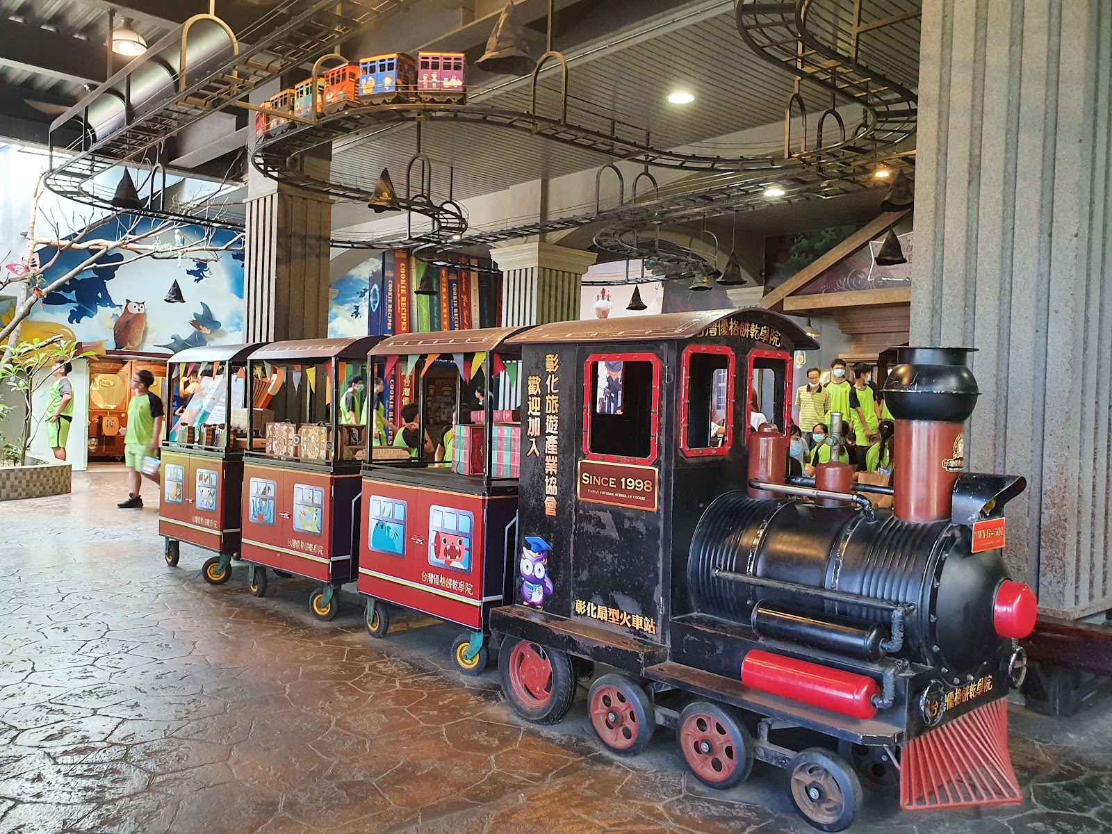 今天的街頭藝人是變臉秀,看表演頭上還有一列火車在天花板上走,美式咖啡好喝,還有超多口味餅乾可以試吃,2樓展示了原物料的使用,還有餅乾的製作過程參觀,透明的生產線,在這裡大家可以看到餅乾的製造過程,看得安心,吃得放心。是一個很棒的地方大人小孩都愛,還可以做餅乾DIY優惠價一個人費用99元,原價是150元/人(巧克力口味) 時間一個小時,熱騰騰的餅乾出爐後,會讓它搭上這輛小火車run一圈自然冷卻,等小火車繞場回來後,就可以打包裝袋了。