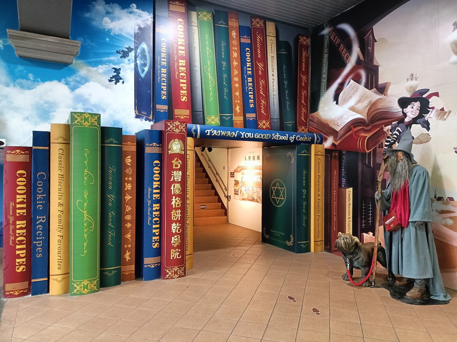 台灣優格餅乾學院可自由參觀不需收取門票,高達2層樓的大型精裝厚本書的入口處,是個拍照的好場景,穿越這個魔法書的巨門,進入一場與現實脫序的異次元世界,很適合帶小朋友的親子景點,可以帶小孩認識餅乾裡面的成分分別有哪些作用,與製作餅乾的流程、現場也有大型器具可馬上讓小朋友了解與功能,還有餅乾的都市傳說