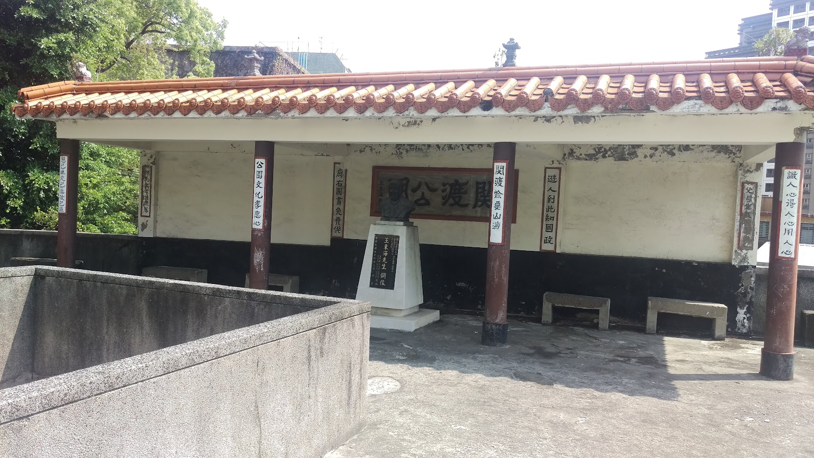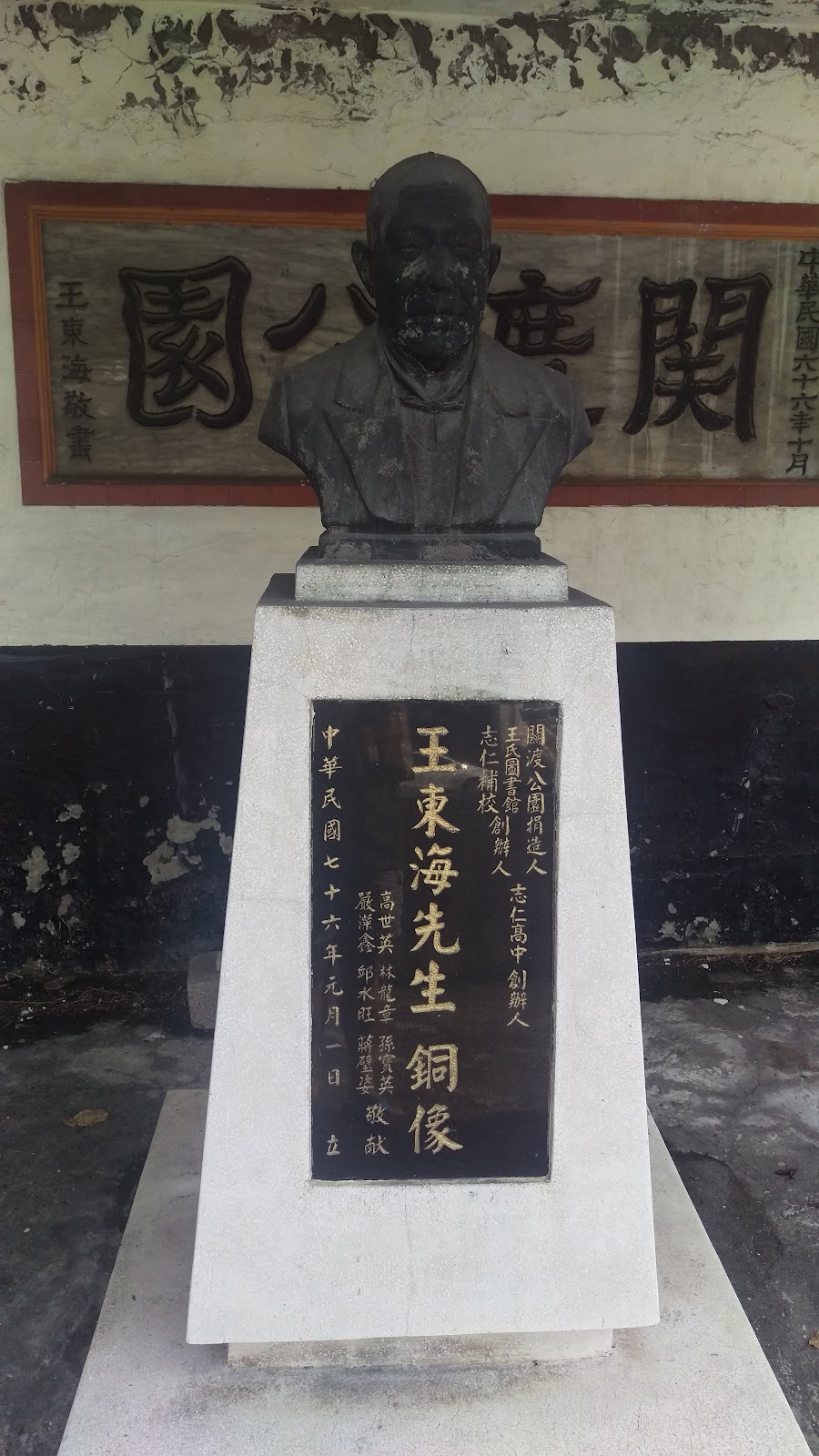1977年因道路拓寬,教善坊被移至現址,並整修為關渡公園,1987年,再豎立王東海先生像。2007年我初次造訪此地,王東海像尚在,結果近年整修後,原塑像位置變成樓梯,王東海像則不知去向。