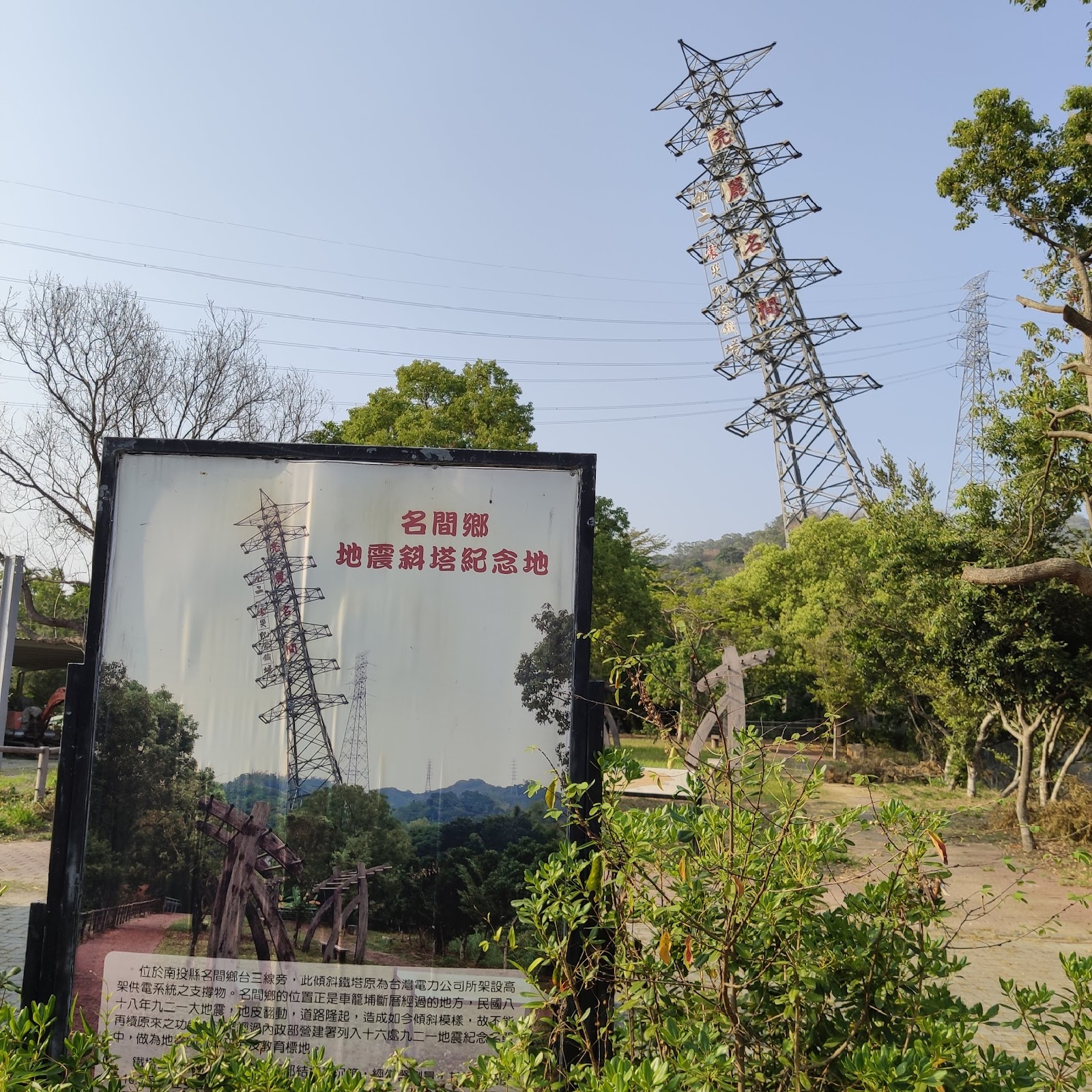 每次經過高速公路國道3號往民間都會看到這斜塔,今天特地來造訪,直接導航到這有設置921斜塔遊憩區立牌,這個因為921大地震而保留傾斜16.5度的高壓電塔區域不大,省思大自然的力量展現讓民眾參觀。