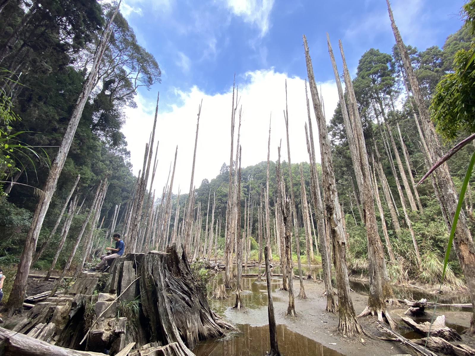 原為一座原始森林,因921大地震後土石坍塌造成了阻塞河道而形成的淤積沼澤,這裡常年有霧氣繚繞故又稱「迷霧森林」,若是上午來當艷陽高照時清澈的水底下除了有多種綠意盎然的水生植物,還有不少的蝌蚪悠遊其中偶發現跳躍的蛙類,搭上藍天白雲和矗立的枯木放鬆心情慢慢欣賞這絕美的風景,若是下午湖面則較多機會出現雲霧和出現水氣朦朧的美景,雖然柳杉枯木已無生命但在沼澤中隱隱出現有種迷濛的神秘氣息,若帶長輩或小孩不想走太多路也可選擇單趟(100元)或來回接駁車費用200元。