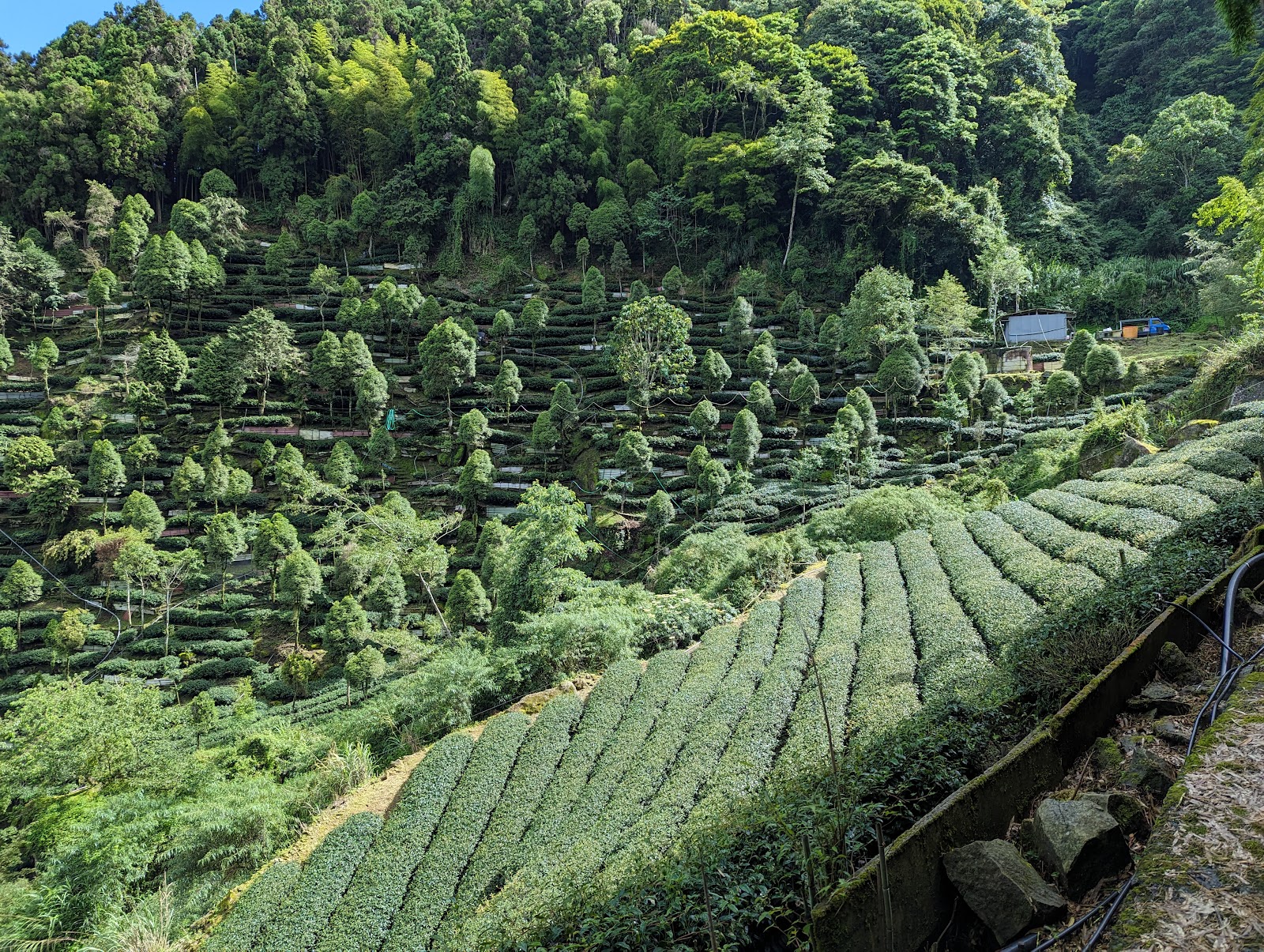 農道的終點是二戶農莊,還有個小小的霧中咖啡館,忘憂森林入口在霧中咖啡館旁邊,不要懷疑,往那條看來是茶園排水溝的通道走上去幾十公尺就到了。