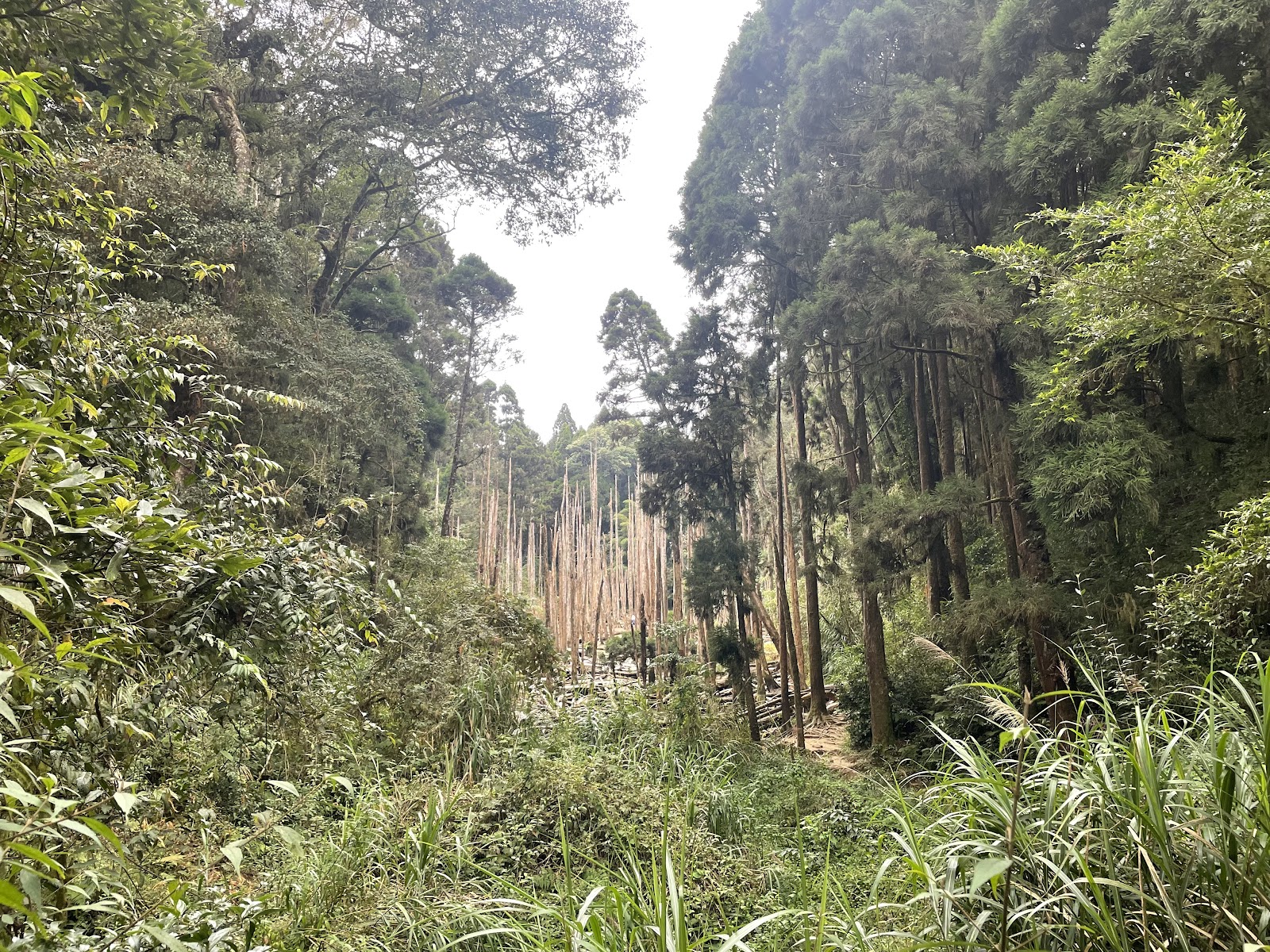鹿谷鄉的人間仙境─南投忘憂森林,忘憂森林是位於南投鹿谷鄉鳳凰南嶺線的支線之ㄧ。由於這裡的林相特殊,終日霧氣迷濛,也有人稱為迷霧森林。登山口在溪頭往杉林溪公路,過了12生肖牌後的留龍頭。忘憂森林是位於杉林溪旁的一片原始森林,原本是一座筆直、茂密的柳杉林木森林,在921大地震後因土石坍方而造成阻塞河道後,形成一處沼澤地,而原本生長於此的柳杉木群也因長期泡水而枯死。