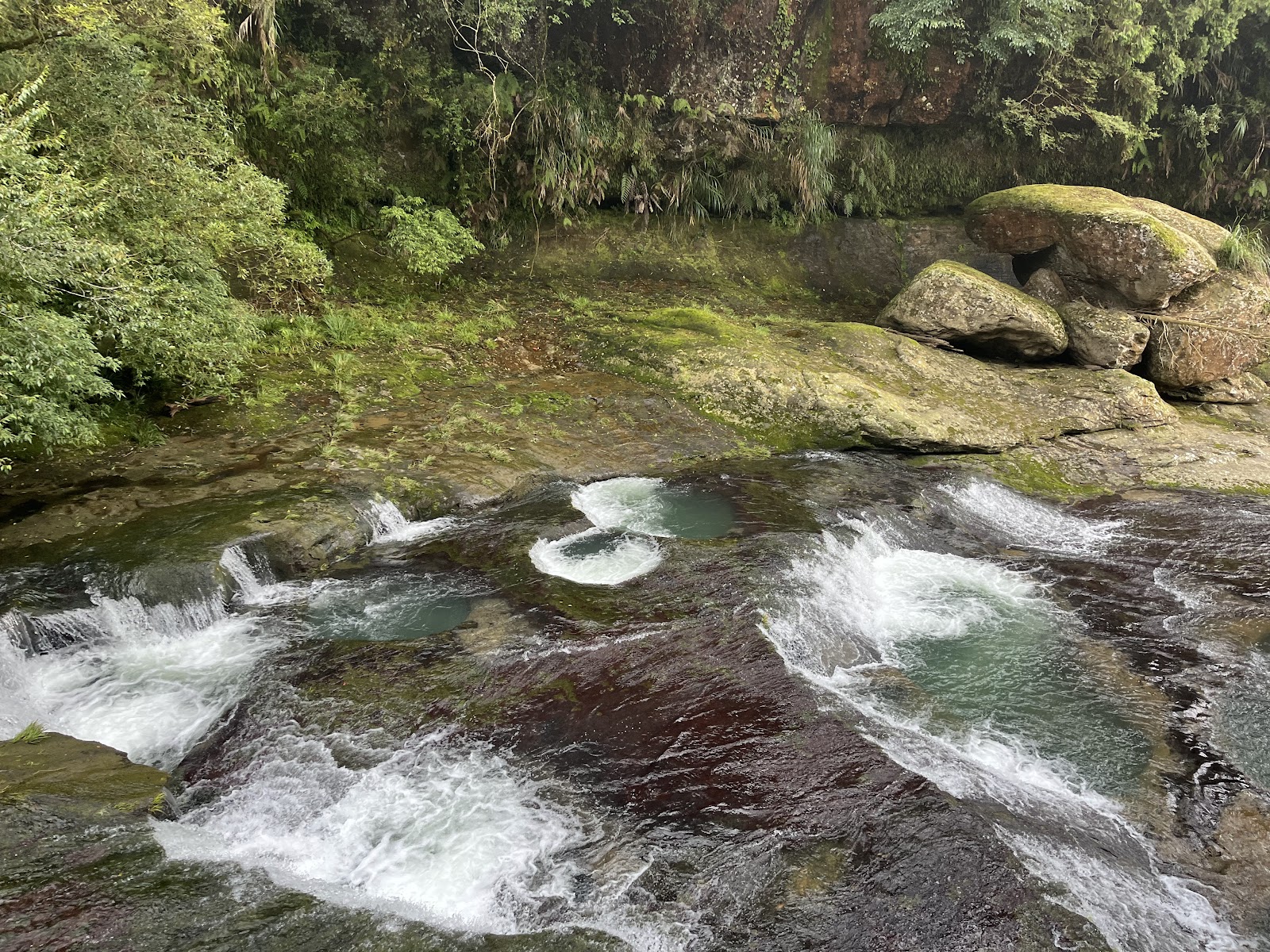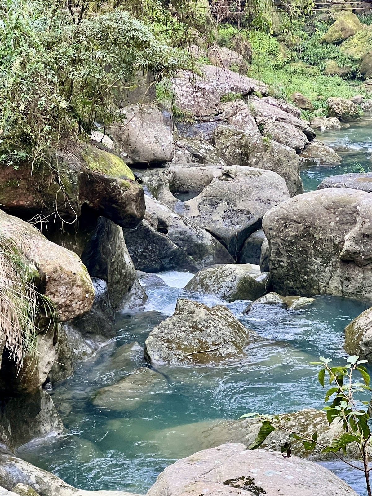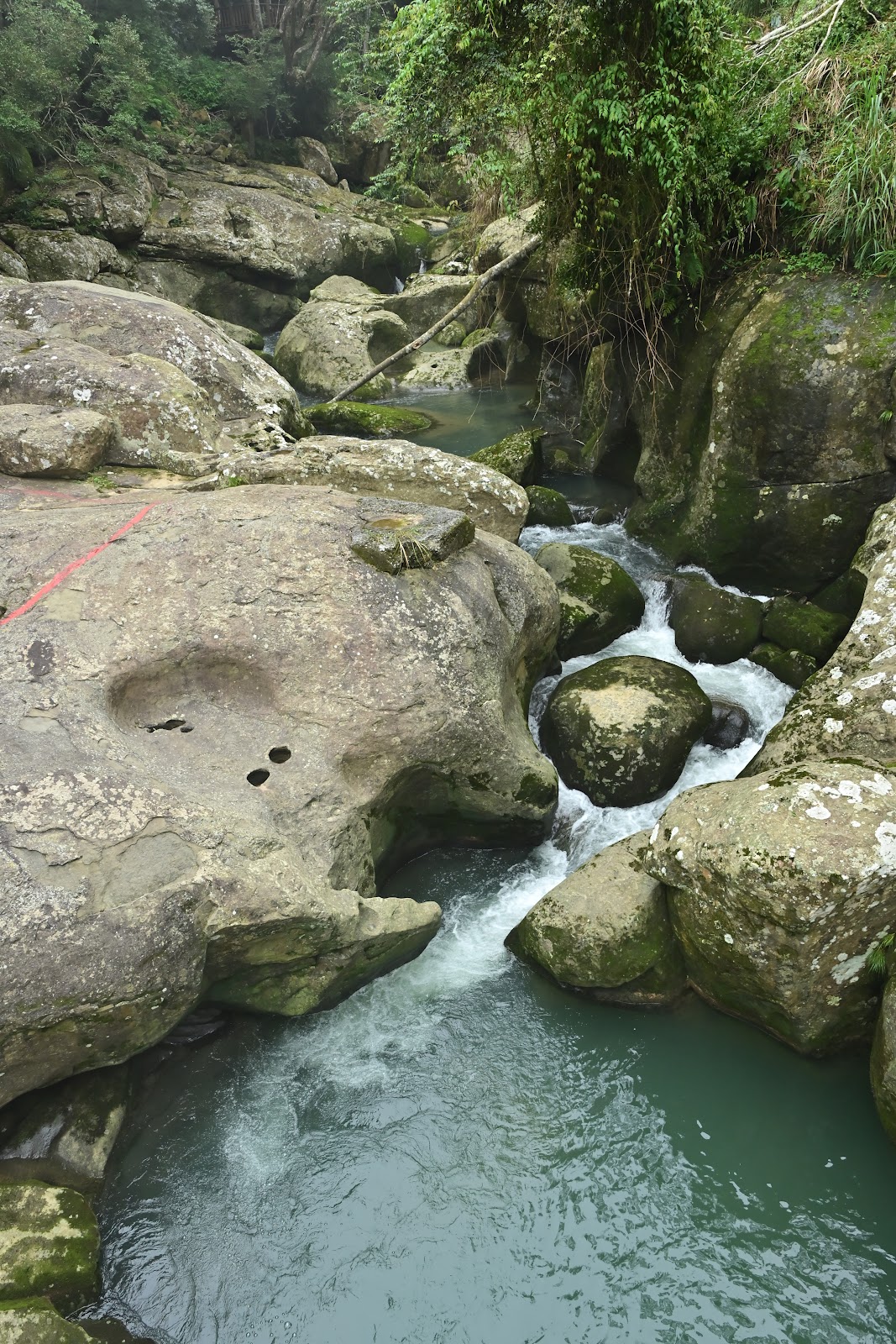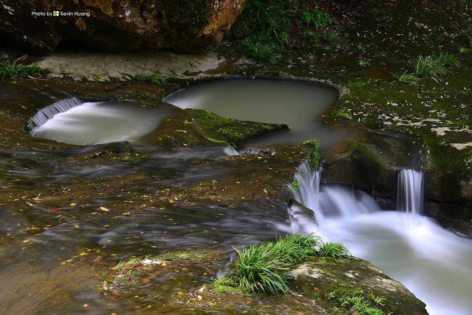 河中巨石經溪流泥沙衝擊碾磨,雕琢出罕見的壺穴地形,散布河床上,形成奇特景觀。