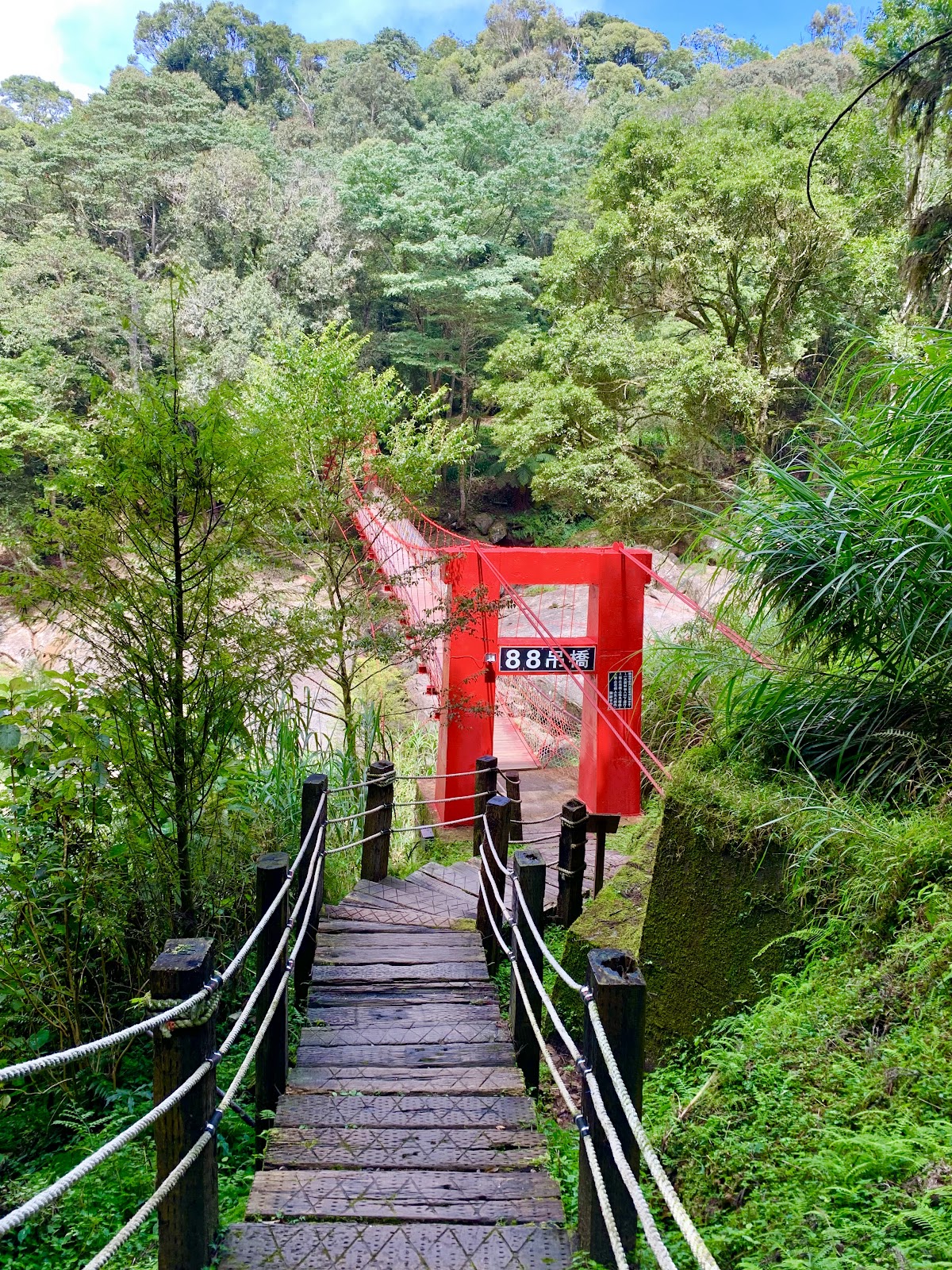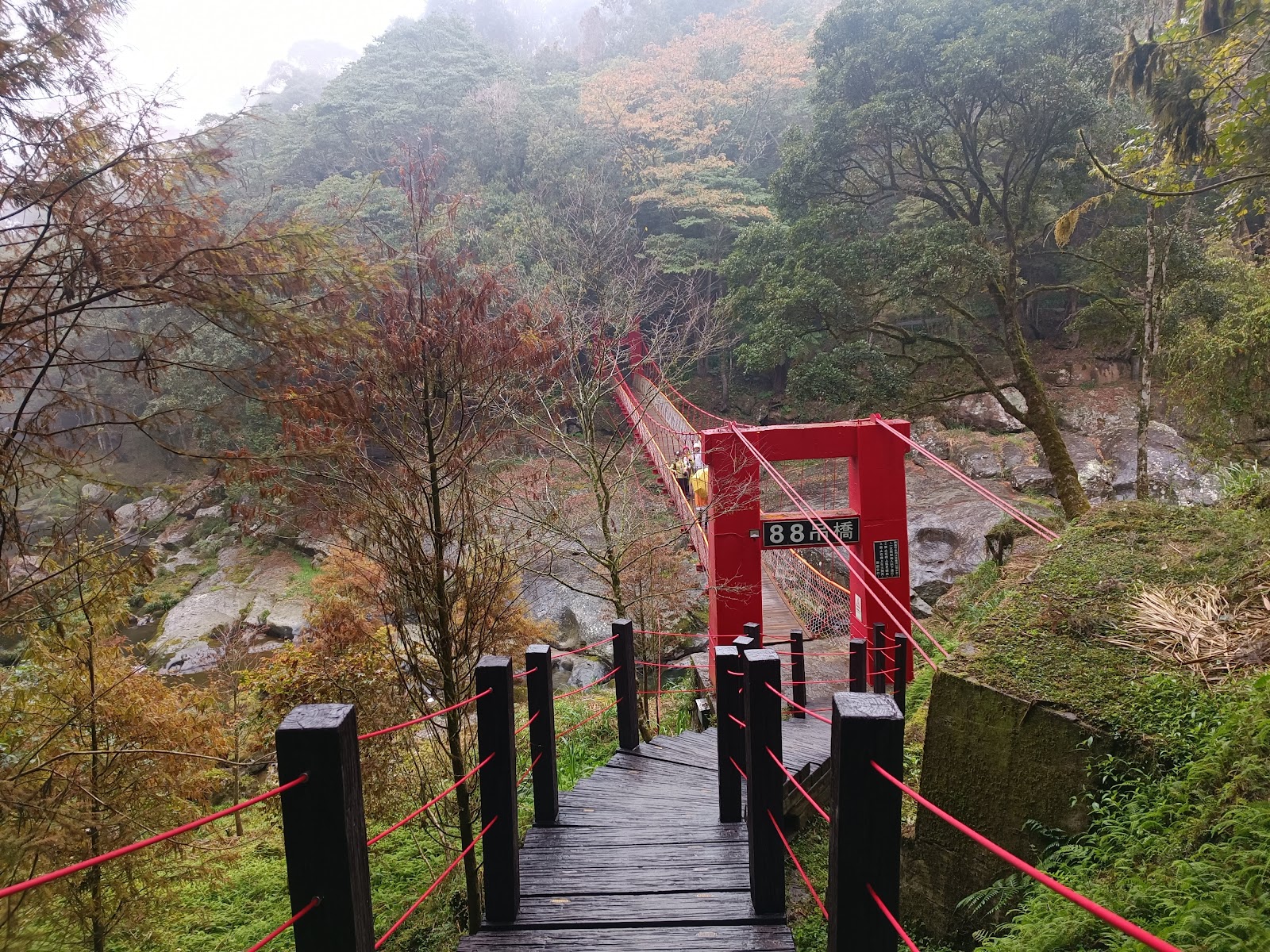 過88吊橋可連接青龍步道及越嶺古道。橋上看加走寮溪,可看到右側的青龍蕨類步道及欣悅台