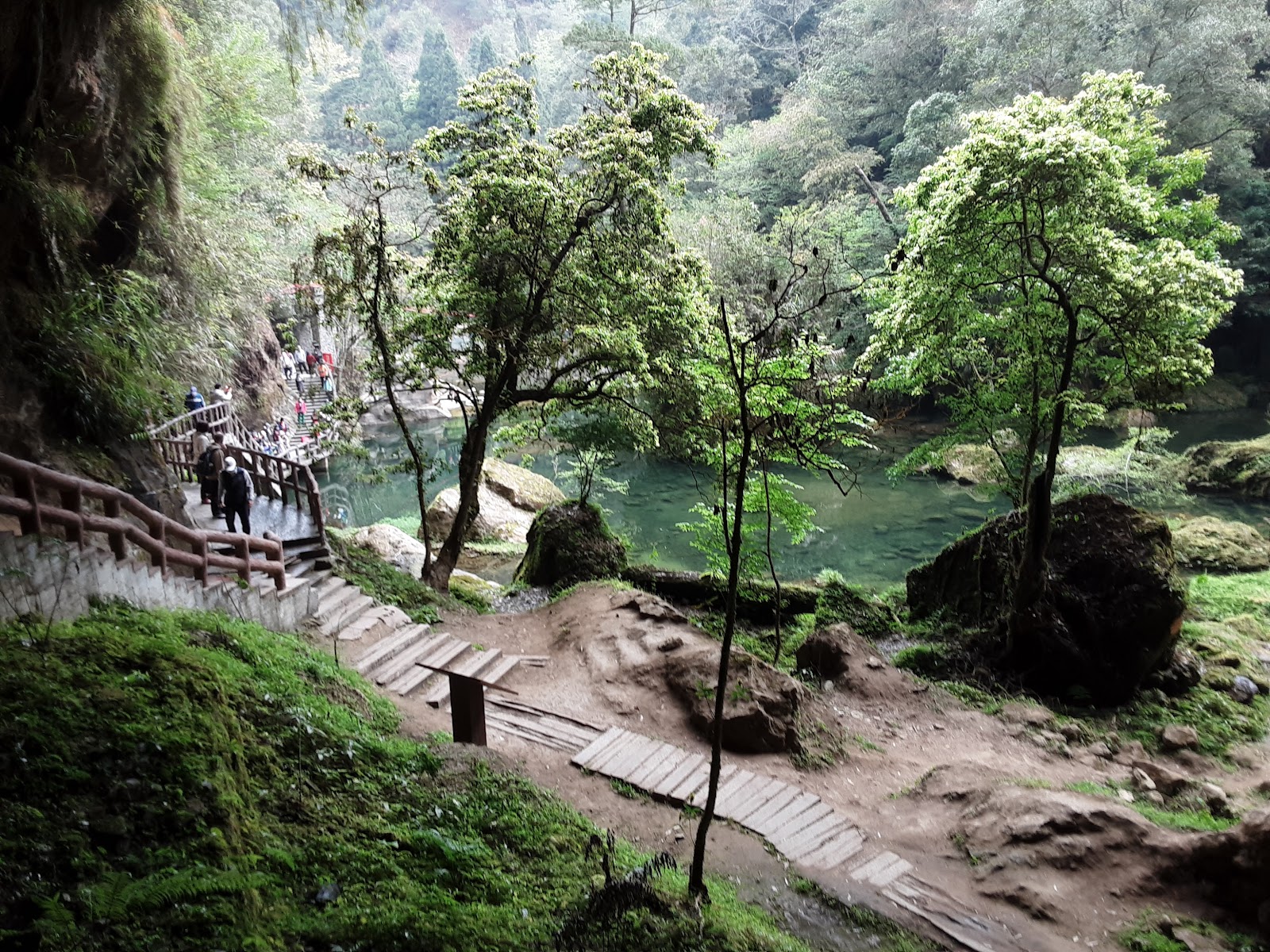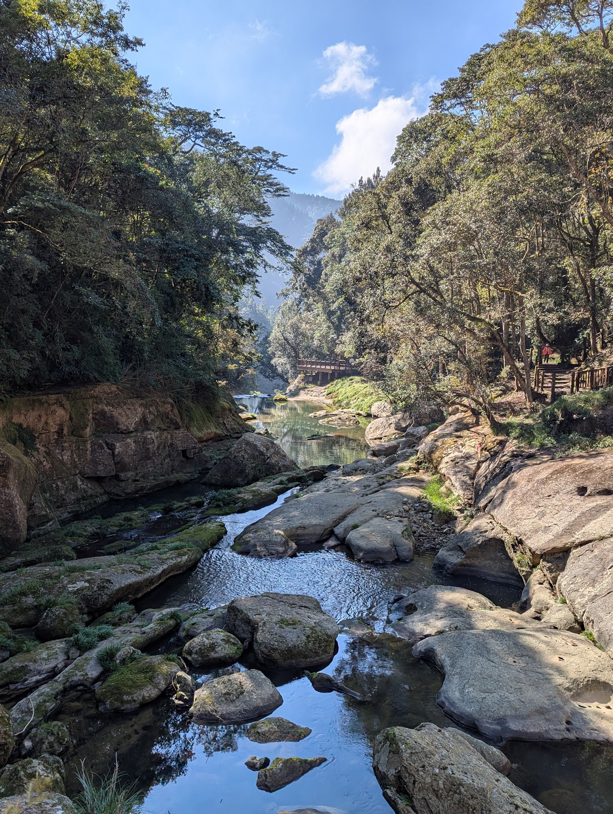 越過拱橋往下走,延著溪畔,銀杏林美景倒映在水面上,美的像一幅畫一樣。延途還有兩座瀑布,如遇水量豐沛非常壯觀。