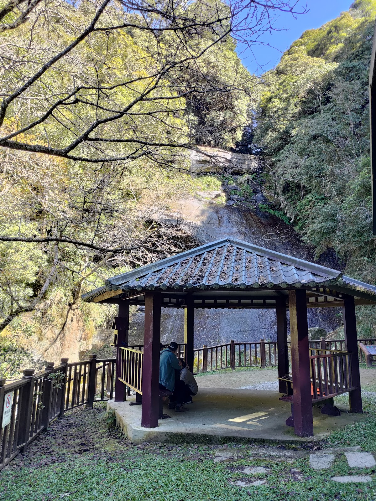 燕庵/龍鱗瀑布,從車道被走上來約200公尺約8分鐘,沿途枕木碎石樓梯上坡,潮溼會滑無扶手;上方有公廁。