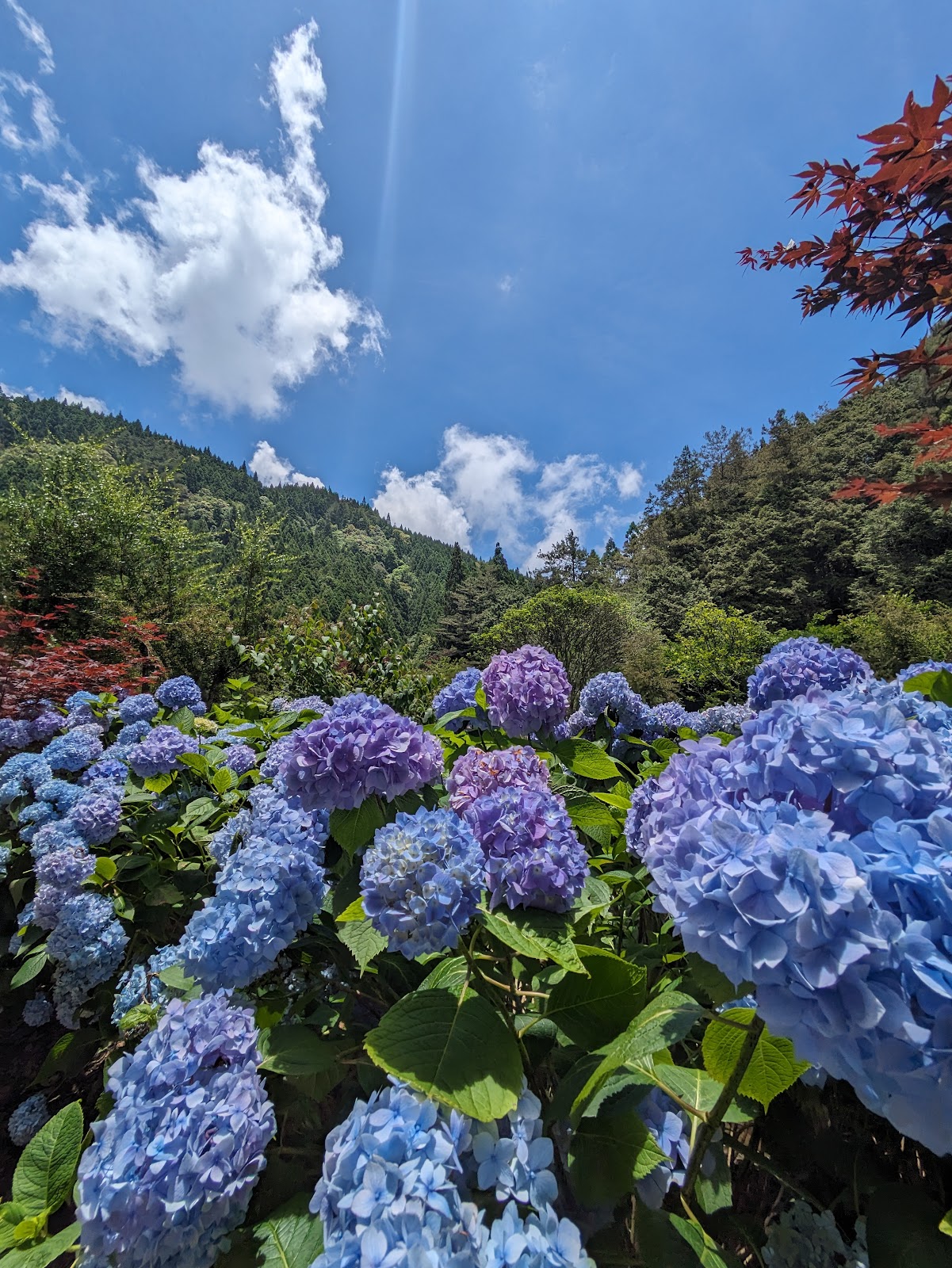 趕在繡球花季的尾聲造訪,雖然已經有些花瓣開始枯萎但整體仍十分有觀賞性,槭樹的紅葉與水池造景和遠處的群山構成一幅美麗的庭院景觀。
