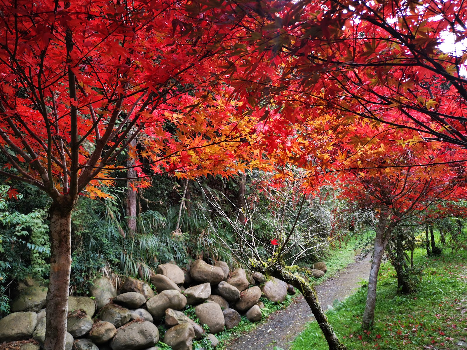 2.園區中花卉中心旁的紫葉槭倒是可來一拍,逆光下的紅真的還不錯!唯一可惜植株目前還略小,五年十年後這區肯定值得秋天一遊!紫葉槭也有部分落葉,以這時間來看約還有8~9成滿紅!