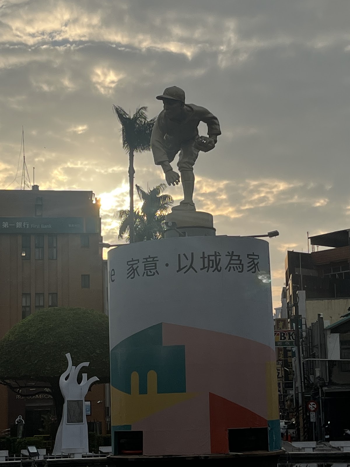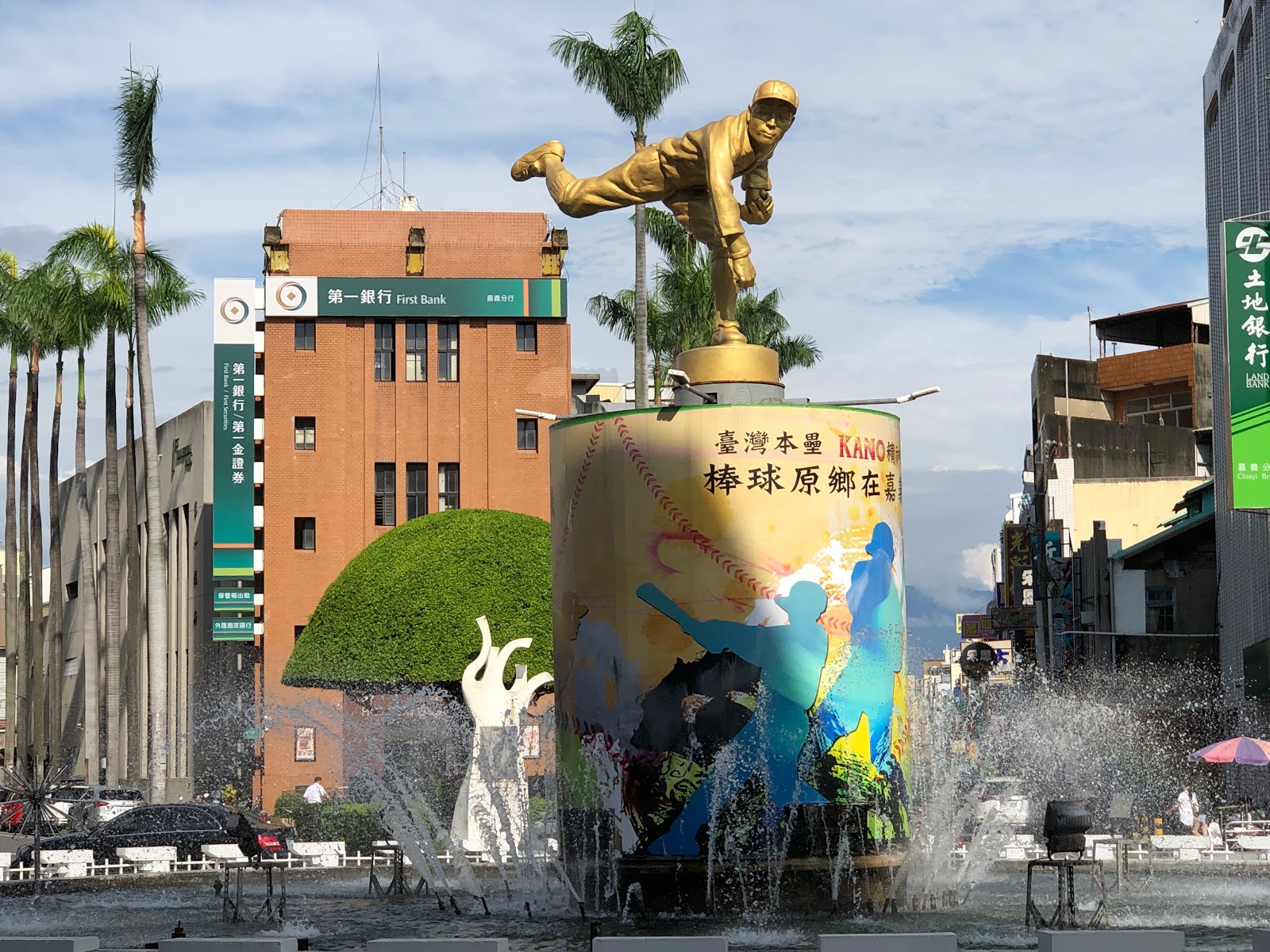 豎立於嘉義市中央七彩噴水池的棒球選手吳明捷雕像「一隻展開翅膀的老鷹─KANO 1931」