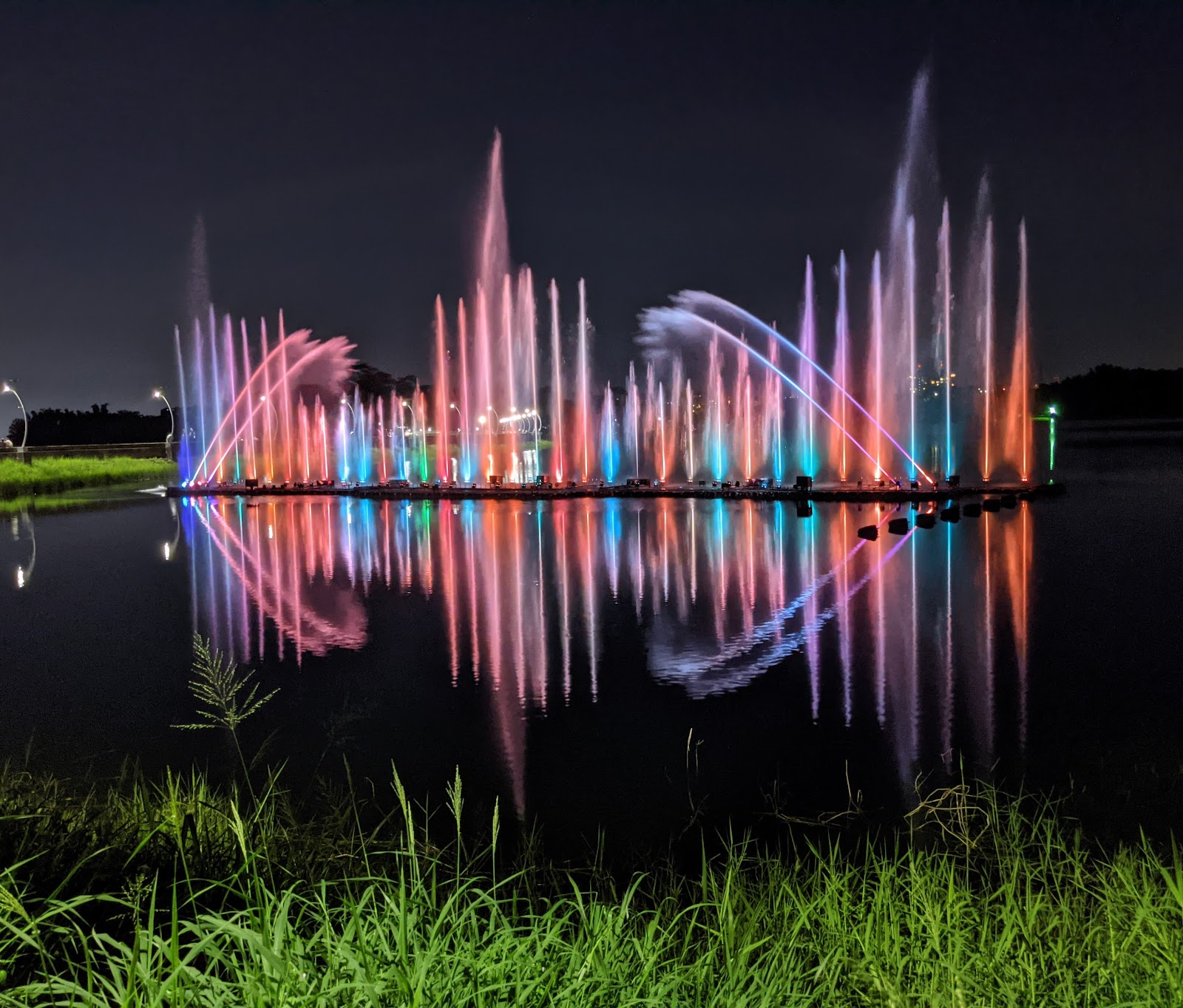 周邊好停車、有公廁,有步道可以散步,花草繽紛。晚上蘭潭會有兩次水舞。