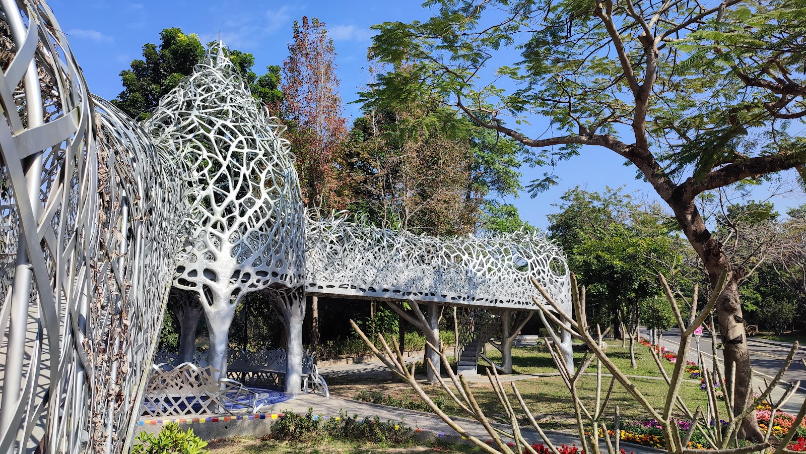 「月影潭心」,是嘉義蘭潭風景區旁一座非常知名的地景藝術裝置 💖。它是由藝術家王文志所設計,以「鳥巢」的意象編織而成,象徵著嘉義市「桃城」的舊稱,也蘊含著歸巢的溫暖寓意。白天時,它是一座獨特的銀色藝術品,到了夜晚,則會搖身一變,成為蘭潭邊最浪漫的亮點。✨